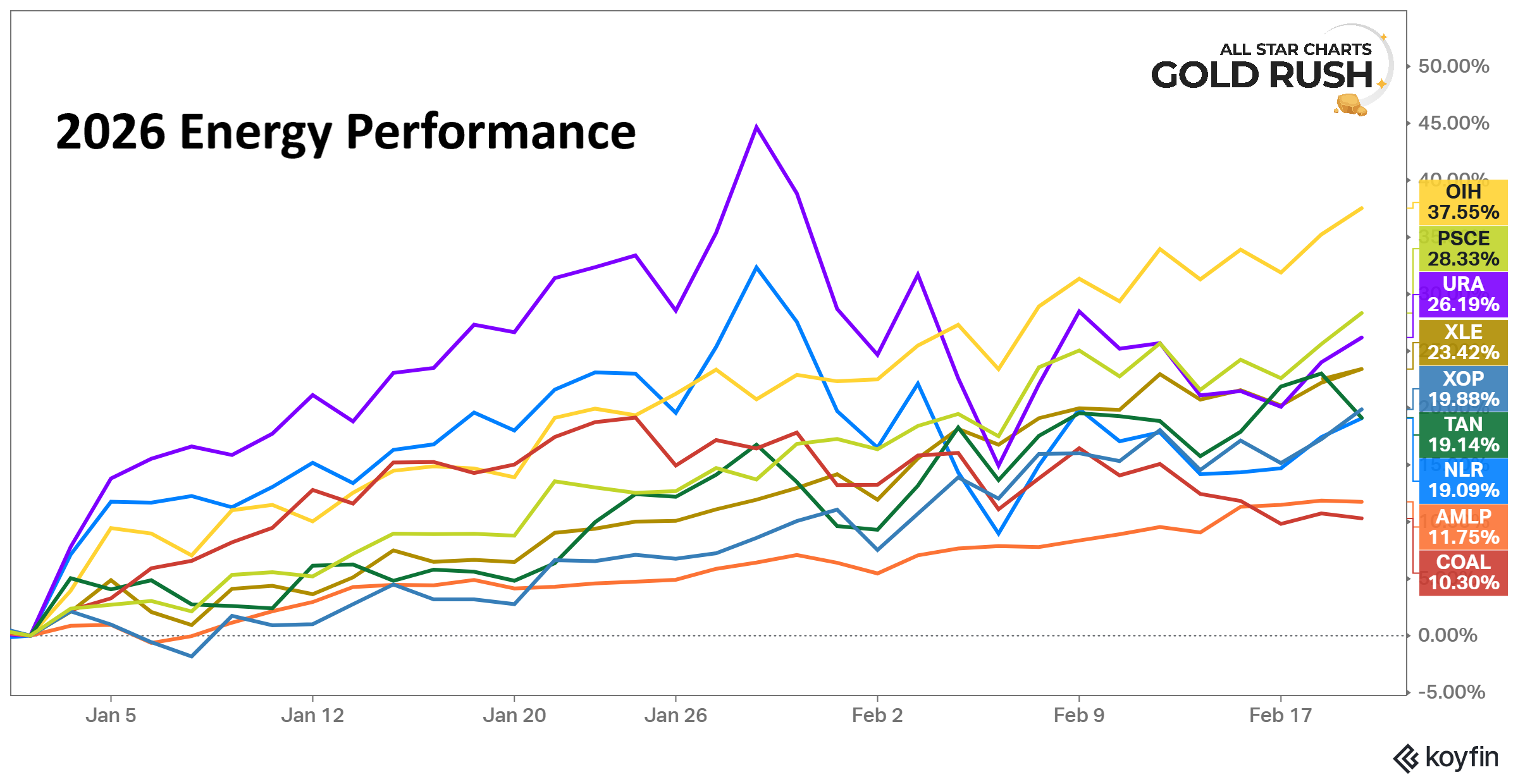 From an alternative energy standpoint, uranium is already emerging as one of the strongest performers in 2026, materially outperforming laggards like coal and solar and keeping pace with some of the best-performing traditional energy groups.