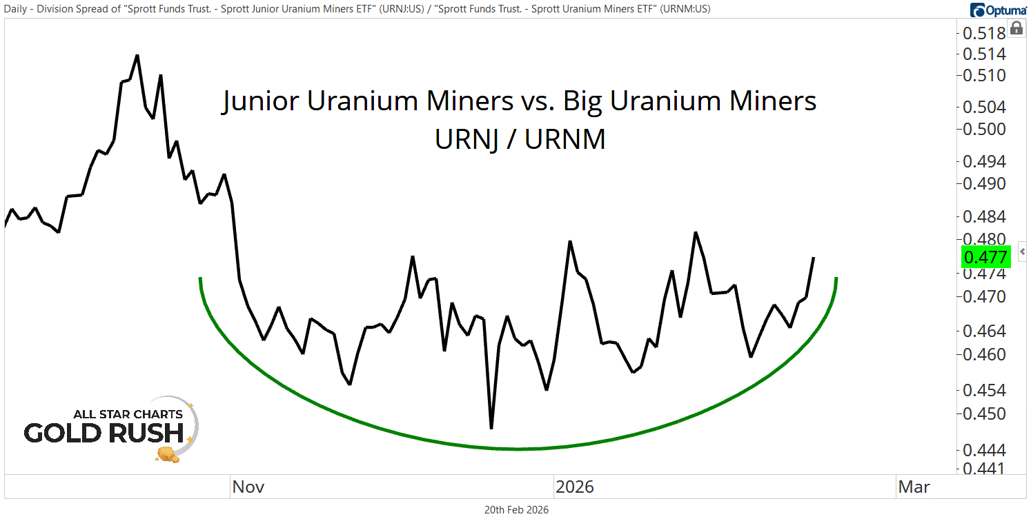 The ratio of Junior Uranium Miners $URNJ to their larger-cap counterparts $URNM has quietly been carving out a bullish reversal pattern of its own over the past several months.