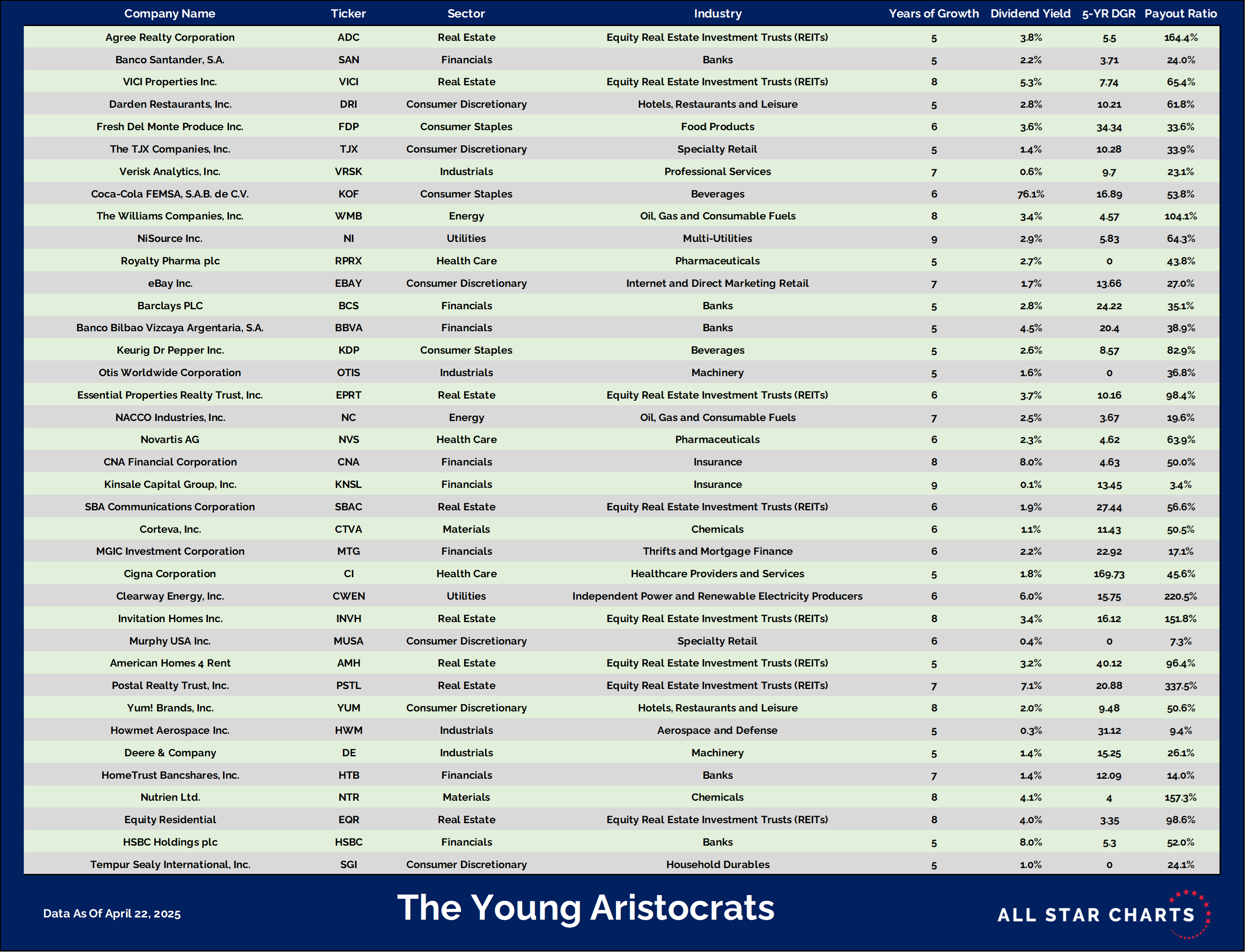 We call them the Young Aristocrats, and the idea is that these are "stocks that pay you to make money." Imagine if years of consistent dividend growth and high momentum and relative strength had a baby, leaving you with the best of the emerging dividend giants that are outperforming the averages.