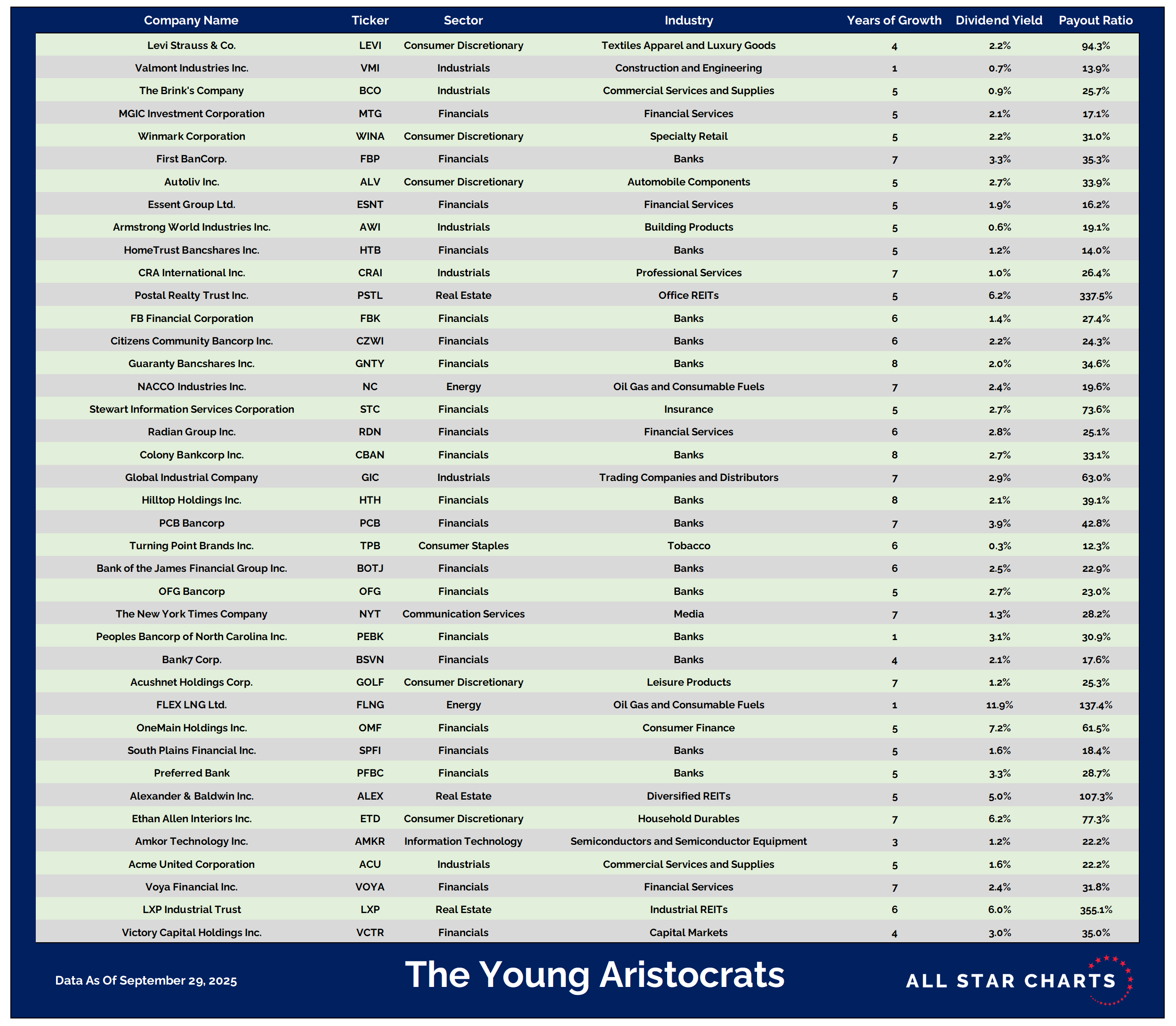 Here at All Star Charts, we like to stay ahead of the curve. That's why we're turning our attention to the future aristocrats. In an effort to seek out the next generation of the cream-of-the-crop dividend plays, we're curating a list of stocks that have raised their payouts every year for five to nine years.