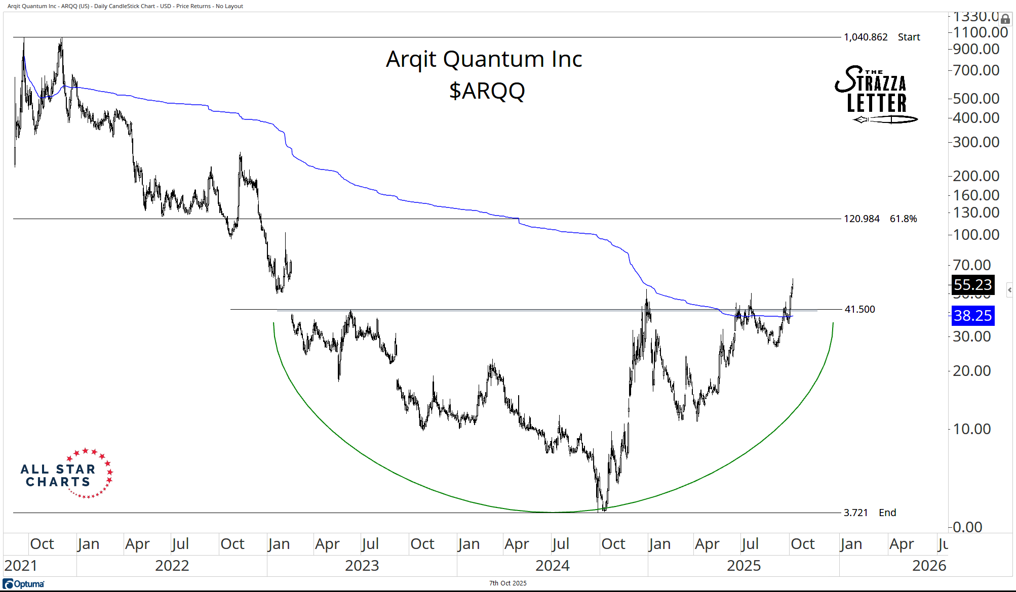 Arqit Quantum has been carving out a multi-year bearish to bullish reversal pattern. Price is finally reclaiming key resistance near 41.50, which is the neckline, or breakout level of the pattern.