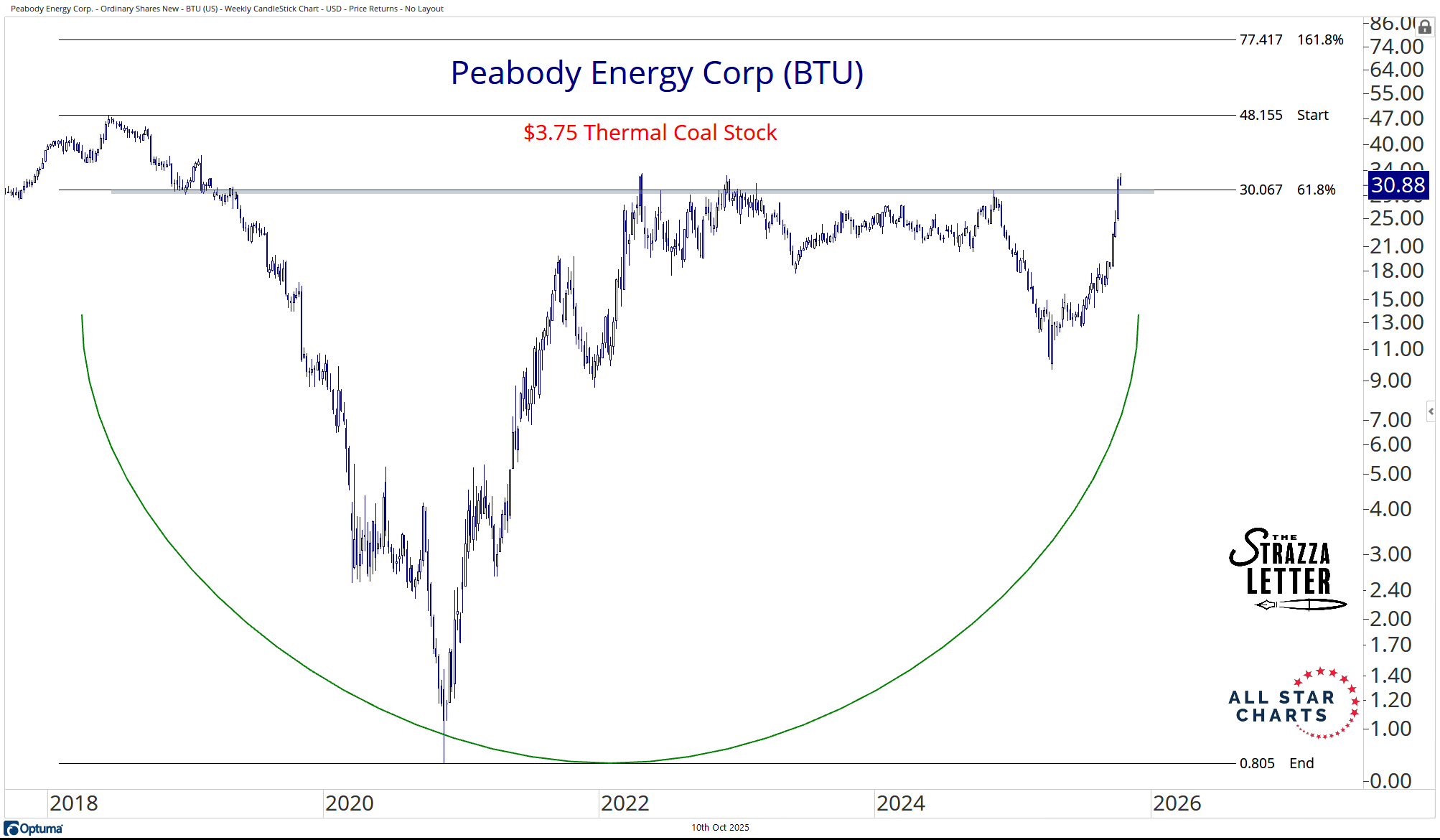 Peabody is powering higher out of a massive multi-year base — one of the cleanest structural reversals in the entire coal space.