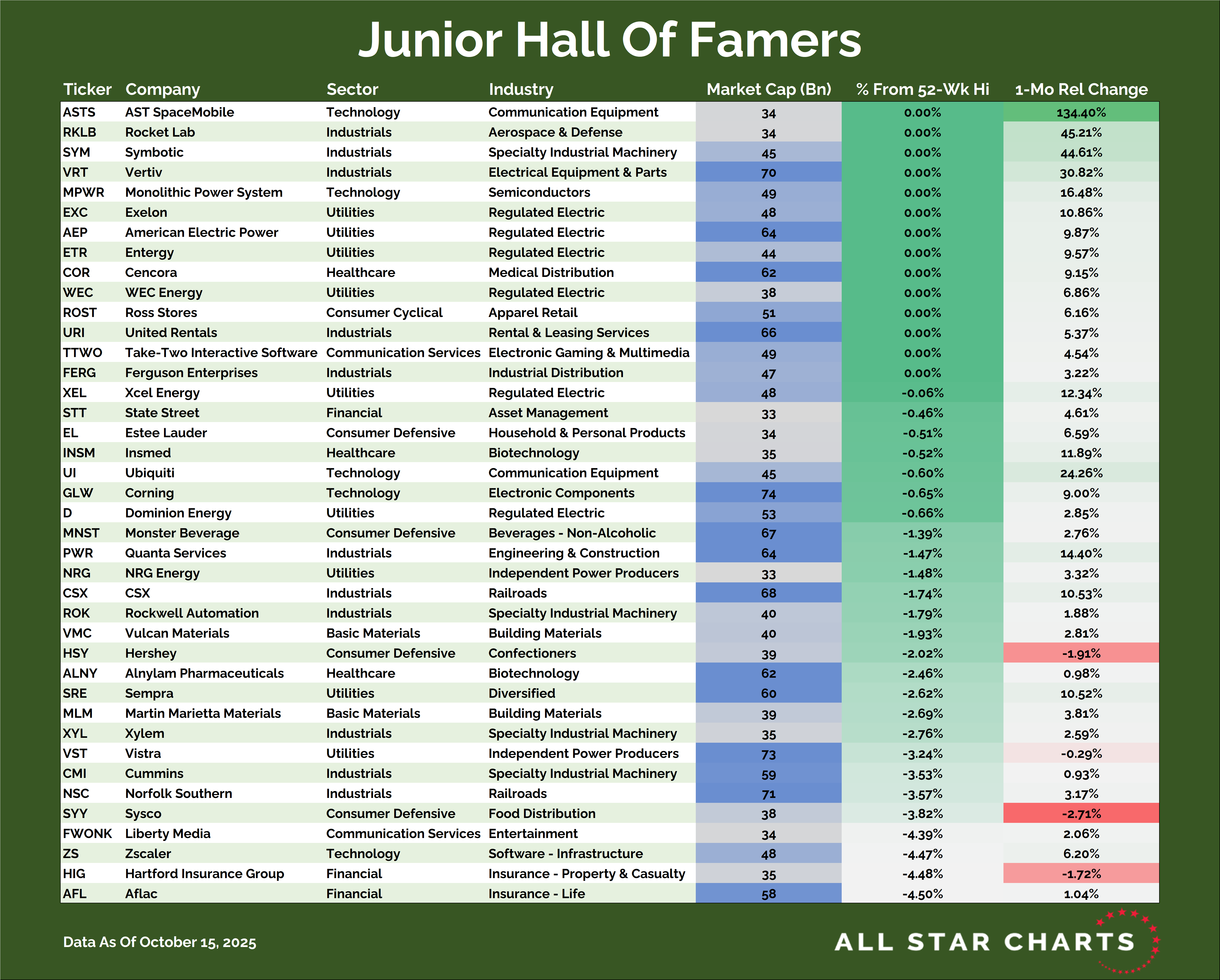This scan is composed of the next 150 largest stocks by market cap, those that come after the top 150 and are thus covered by the Hall of Famers universe. Many of these names will someday graduate and join our original Hall Of Famers list. The idea here is to catch these big trends as early on as possible.