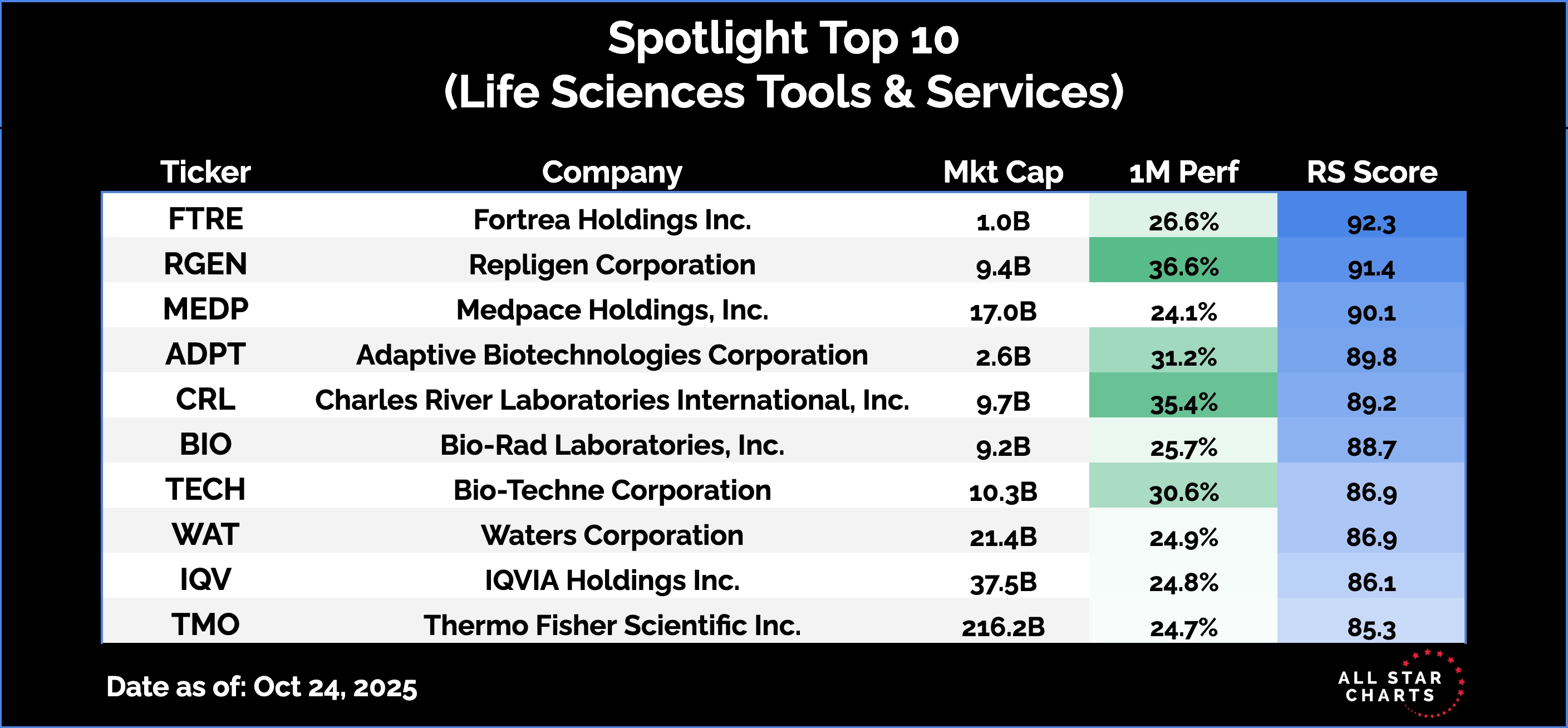 Here are the Top 10 names in the Life Sciences Tools subsector, ranked by relative strength.