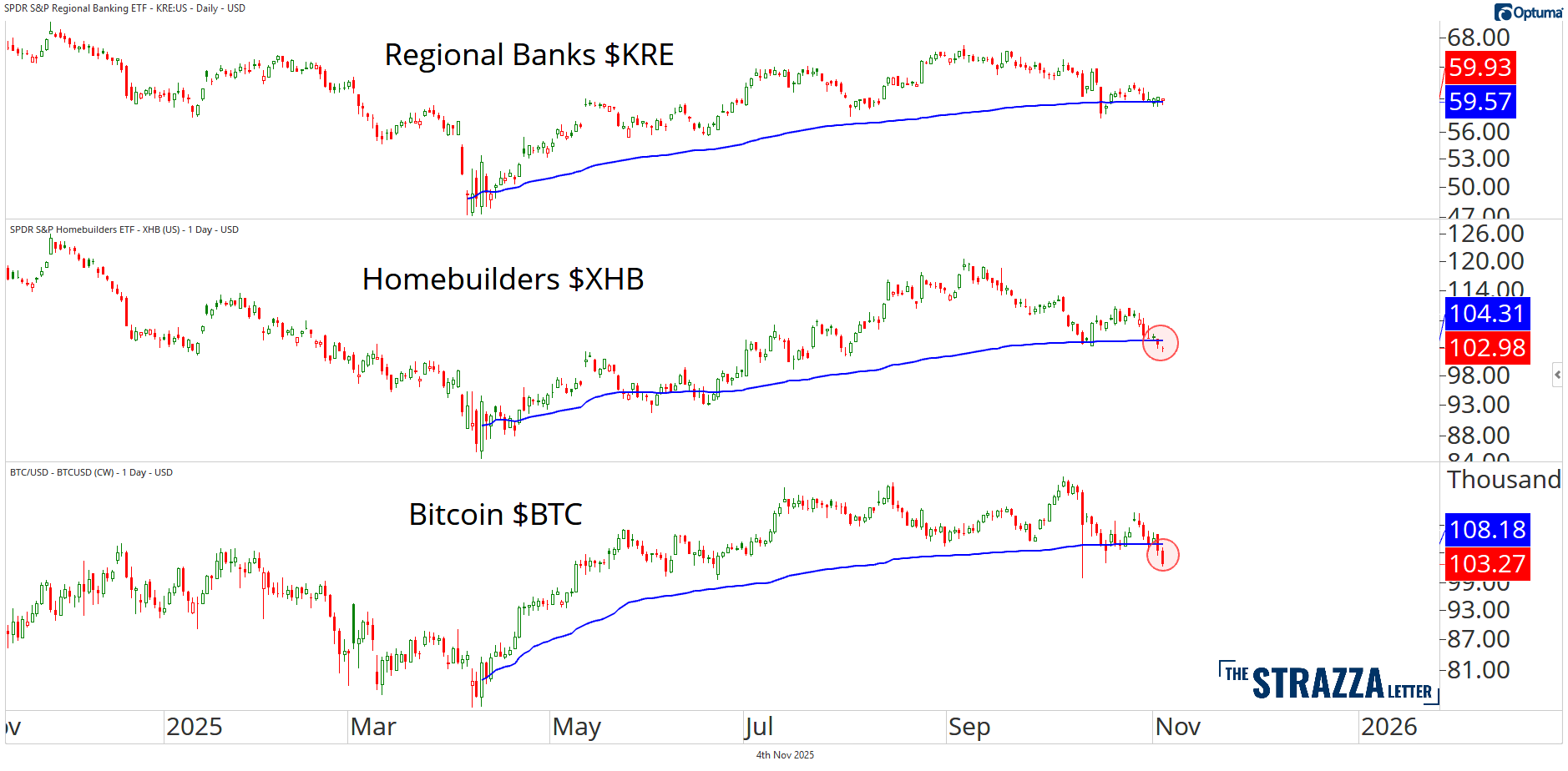Key risk-on areas — Regional Banks, Homebuilders, and Bitcoin — are flashing warning signs, suggesting heightened downside risk.
