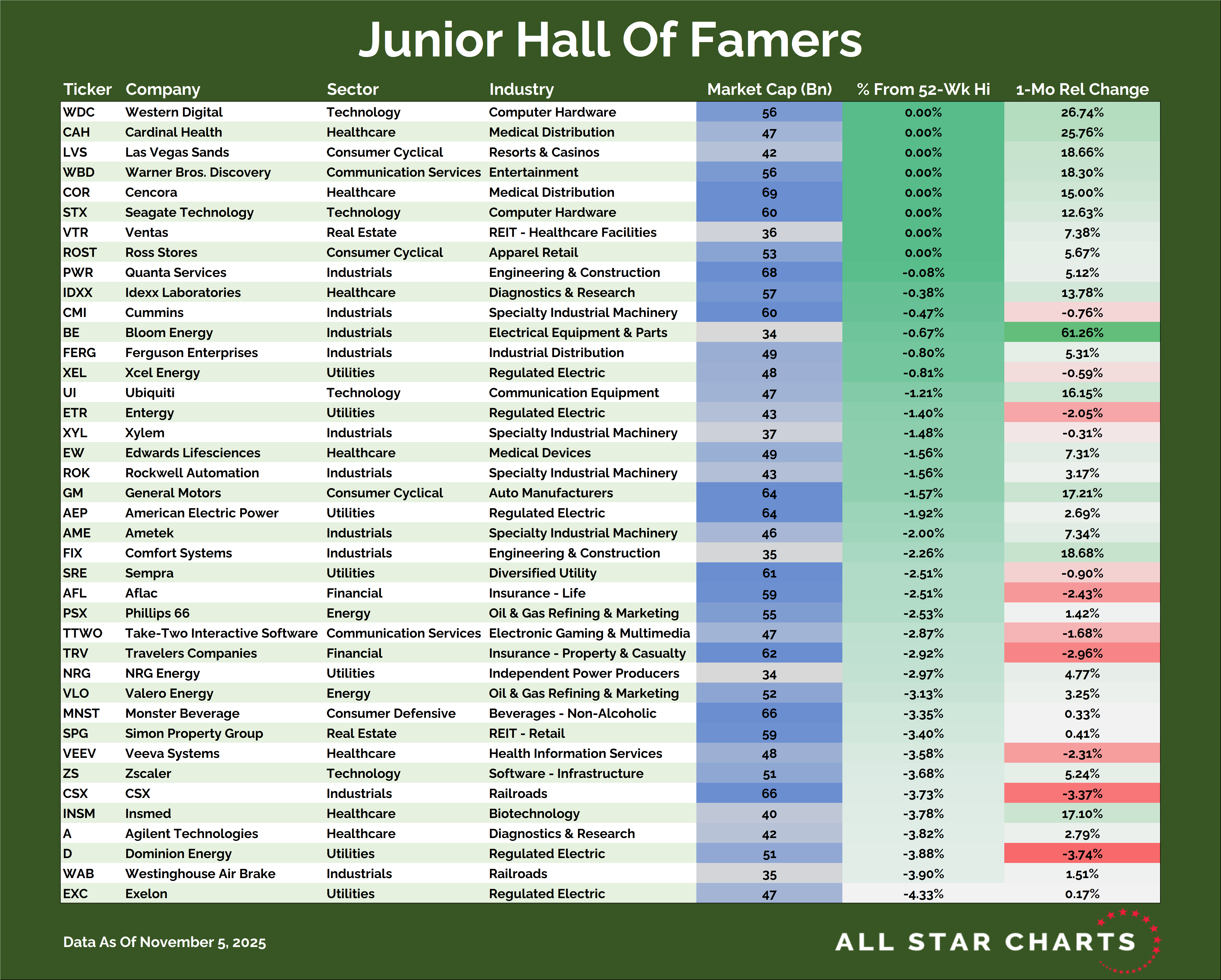 This scan is composed of the next 150 largest stocks by market cap, those that come after the top 150 and are thus covered by the Hall of Famers universe. Many of these names will someday graduate and join our original Hall Of Famers list. The idea here is to catch these big trends as early on as possible.