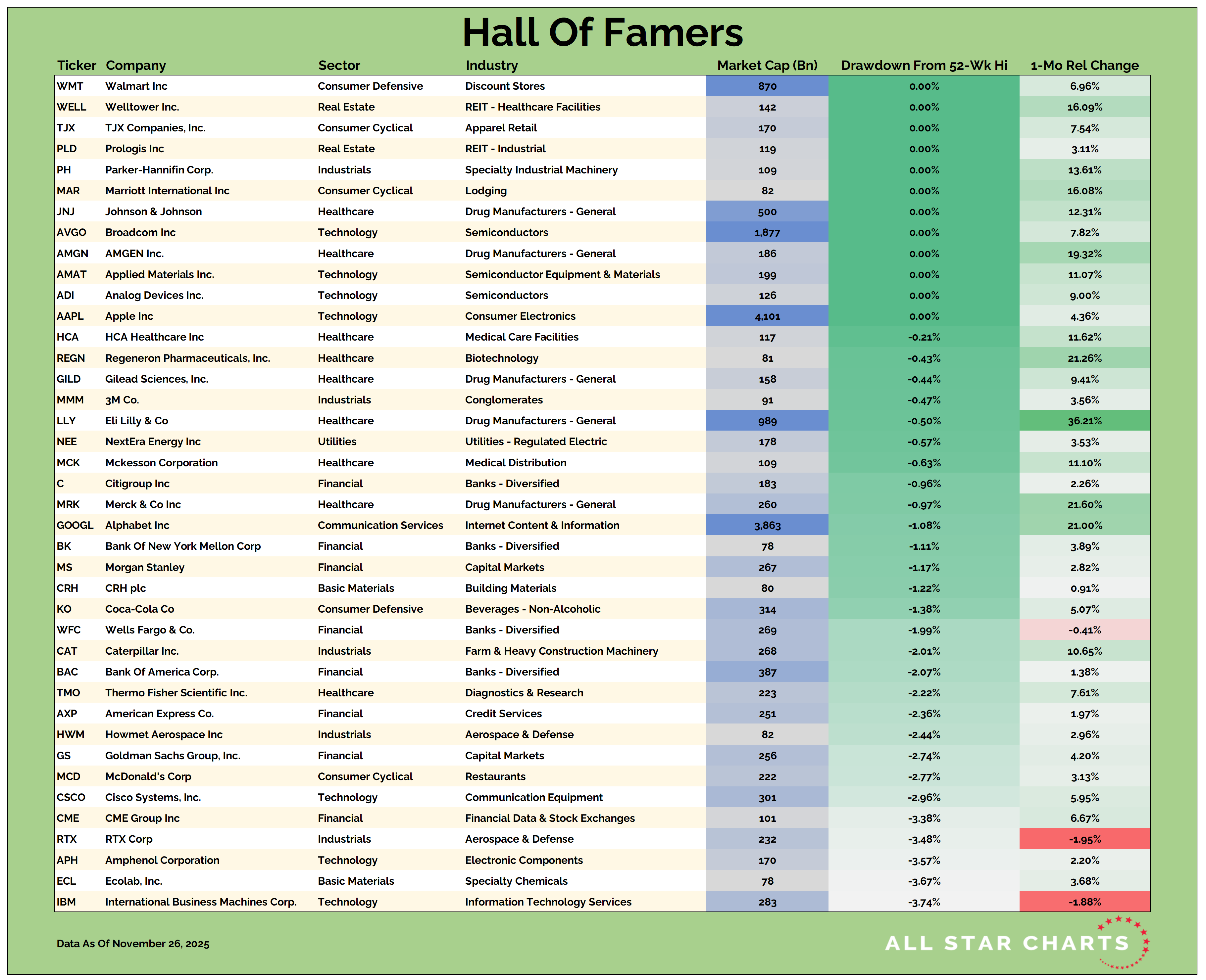 Our Hall of Famers list is composed of the 150 largest US-based stocks.