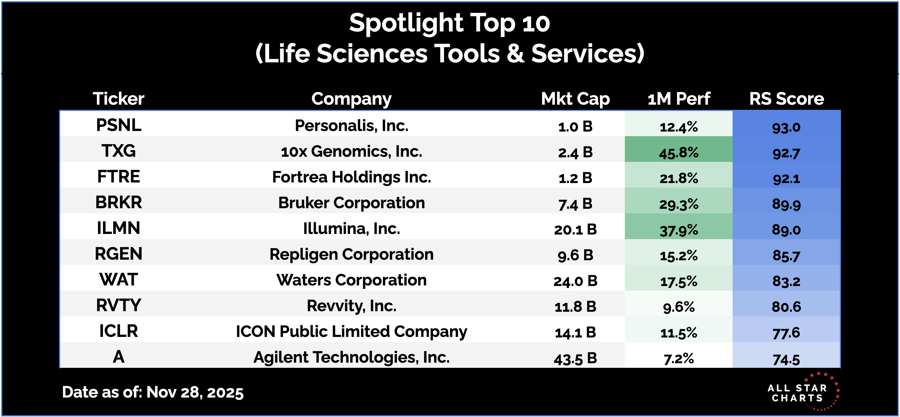 Here are the Top 10 names in the Life Sciences Tools subsector, ranked by relative strength.