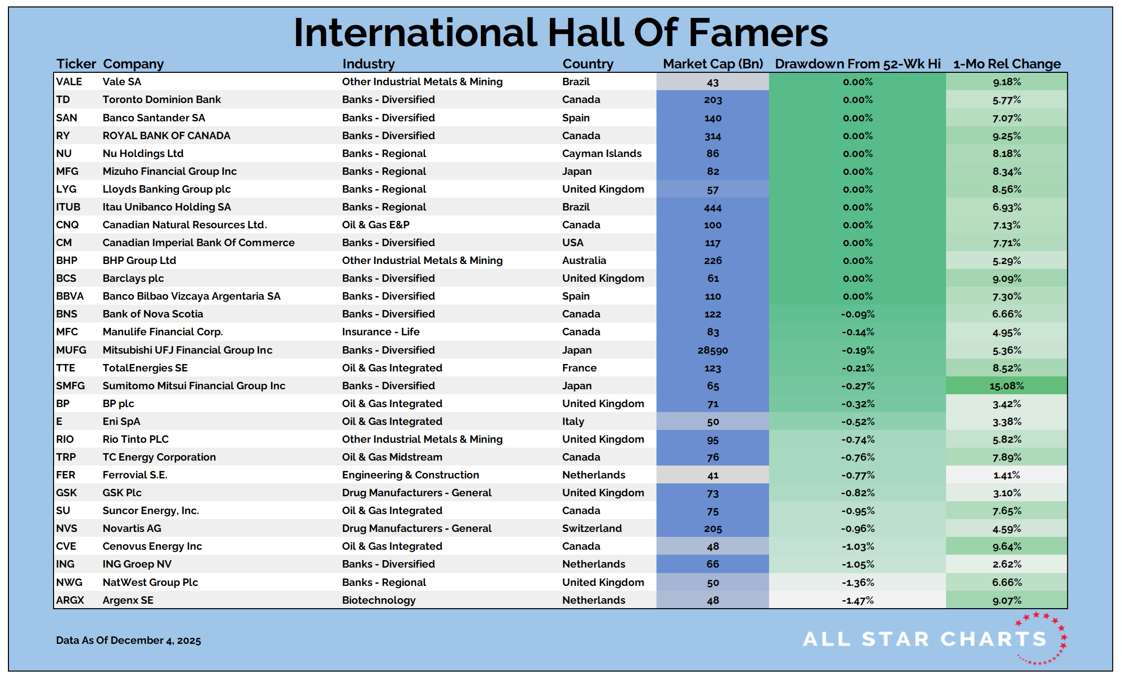 Our International Hall of Famers list is composed of the 100 largest US-listed international stocks, or ADRs.