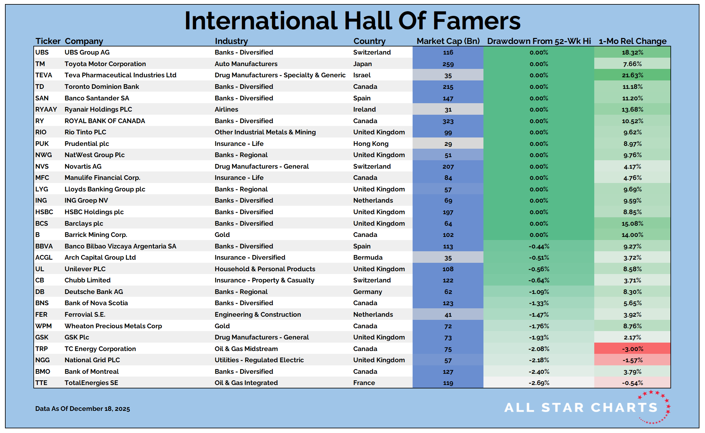 Our International Hall of Famers list is composed of the 100 largest US-listed international stocks, or ADRs.