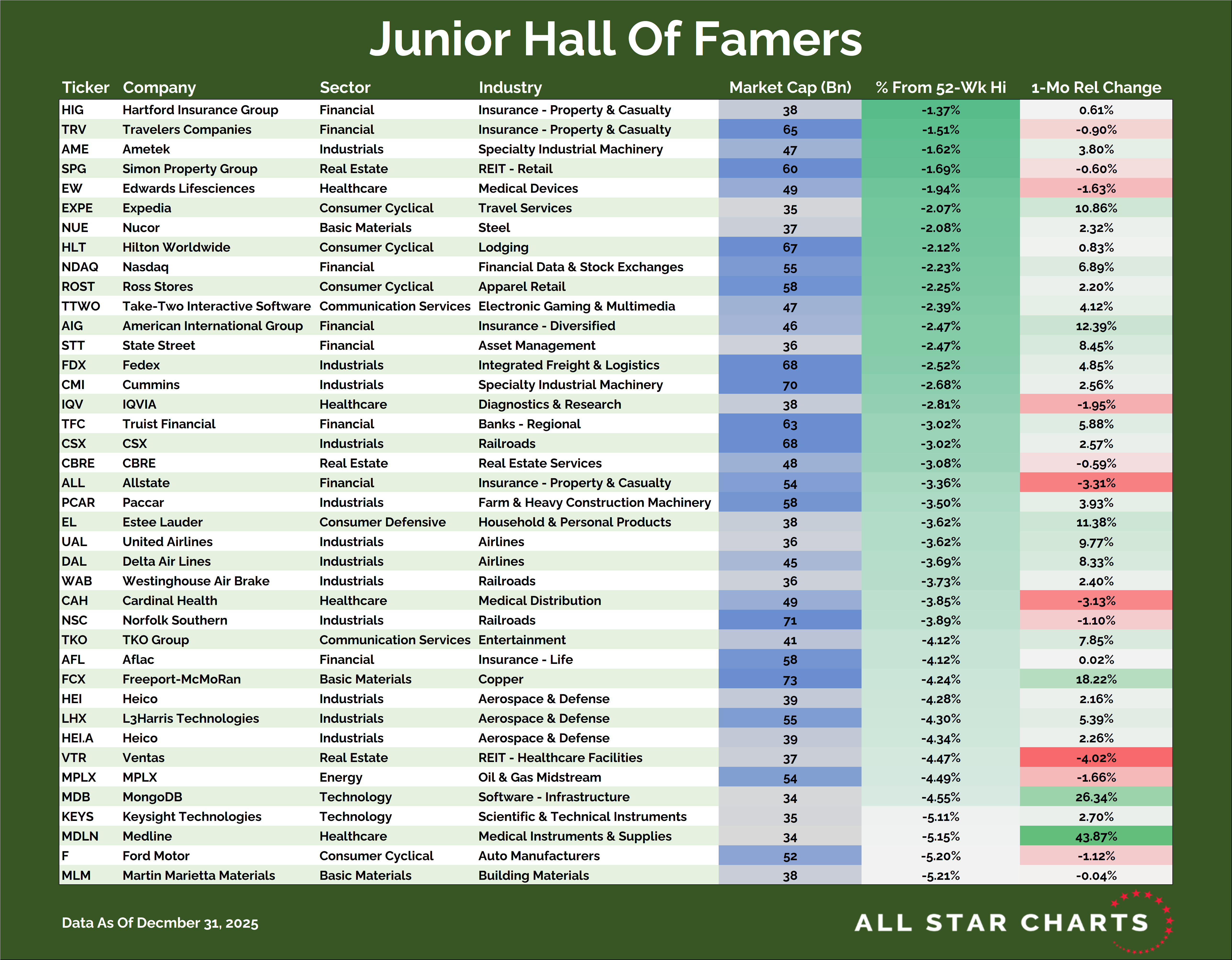 This scan is composed of the next 150 largest stocks by market cap, those that come after the top 150 and are thus covered by the Hall of Famers universe. Many of these names will someday graduate and join our original Hall Of Famers list. The idea here is to catch these big trends as early on as possible.