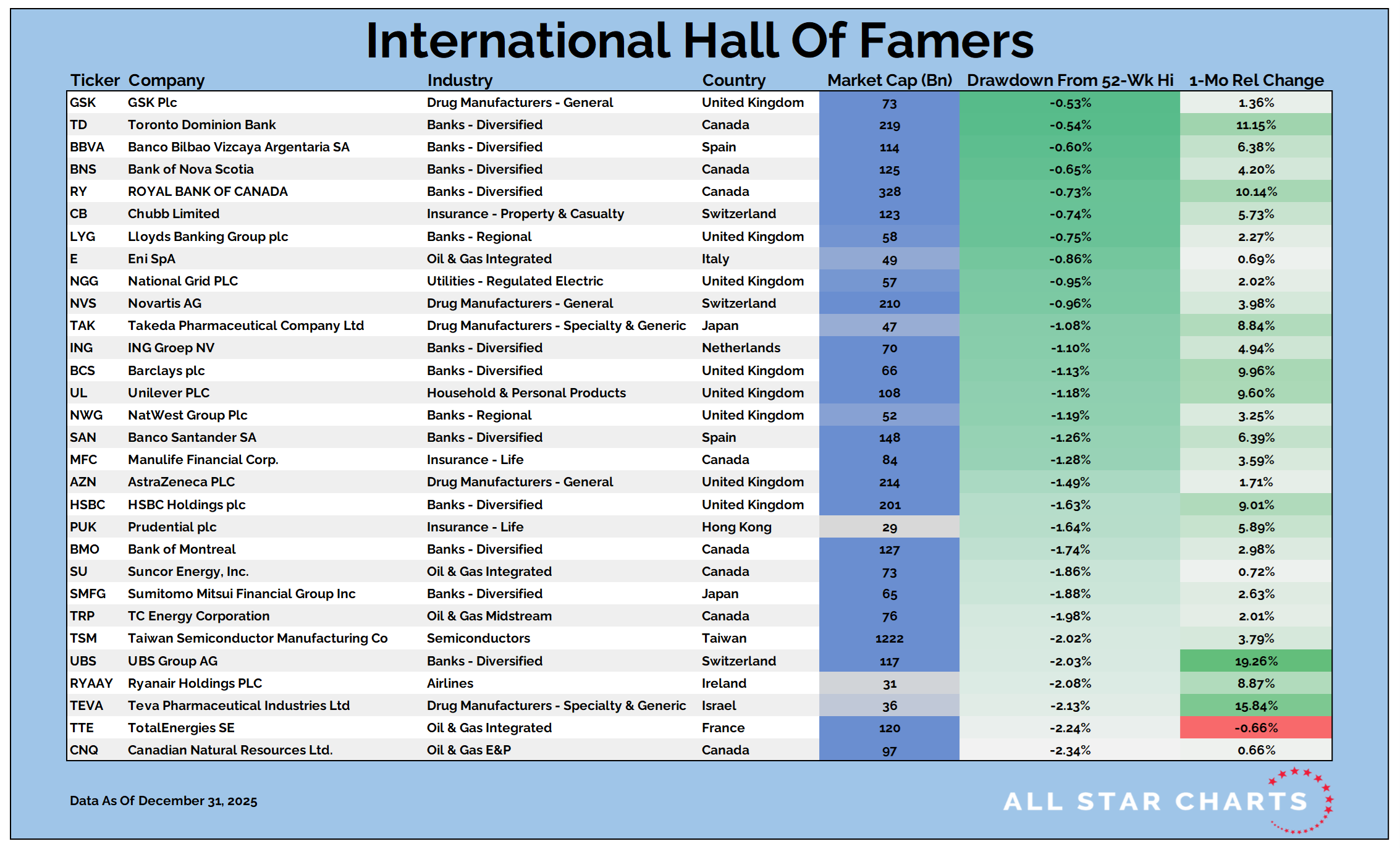 Our International Hall of Famers list is composed of the 100 largest US-listed international stocks, or ADRs.