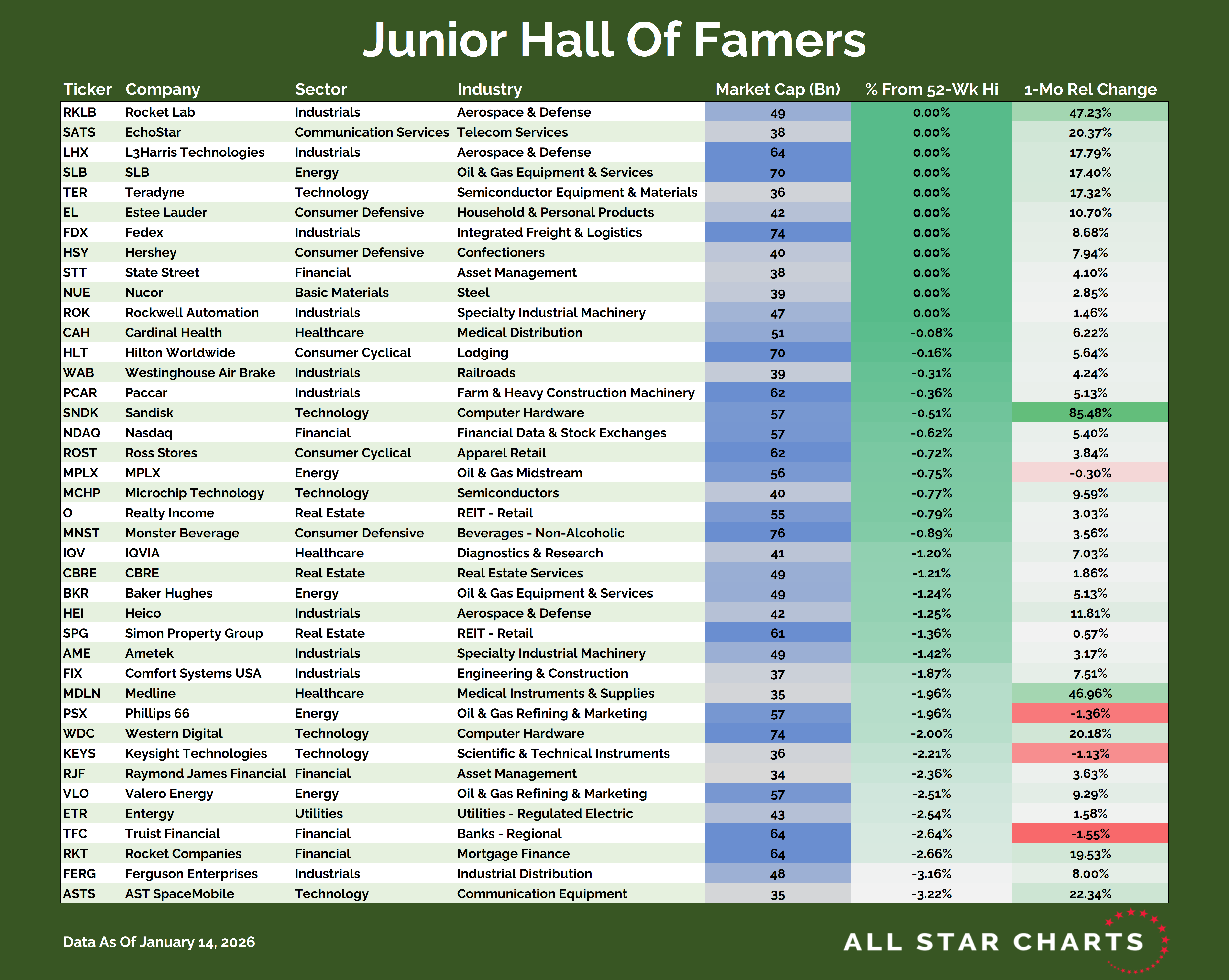 This scan is composed of the next 150 largest stocks by market cap, those that come after the top 150 and are thus covered by the Hall of Famers universe. Many of these names will someday graduate and join our original Hall Of Famers list. The idea here is to catch these big trends as early on as possible.