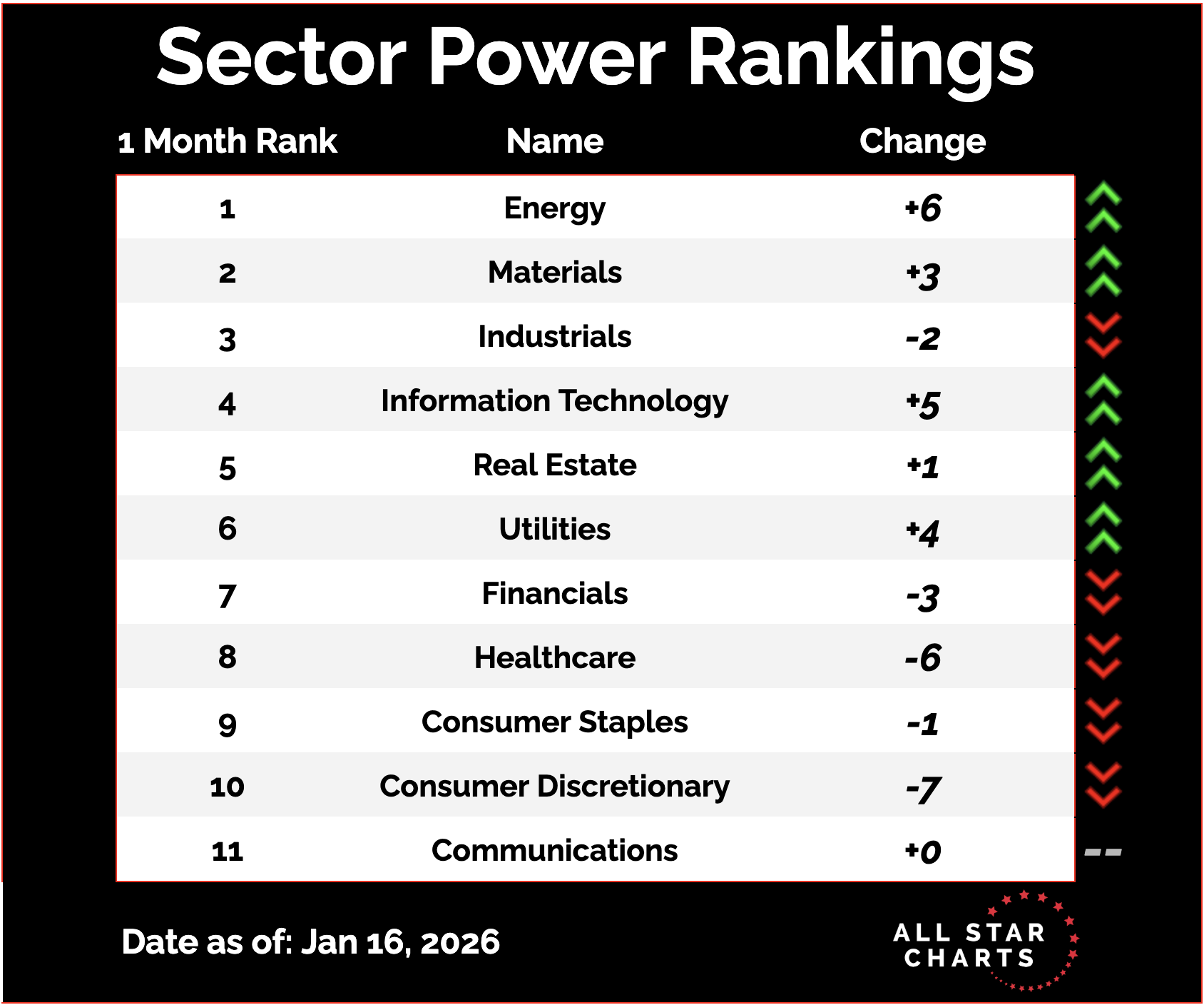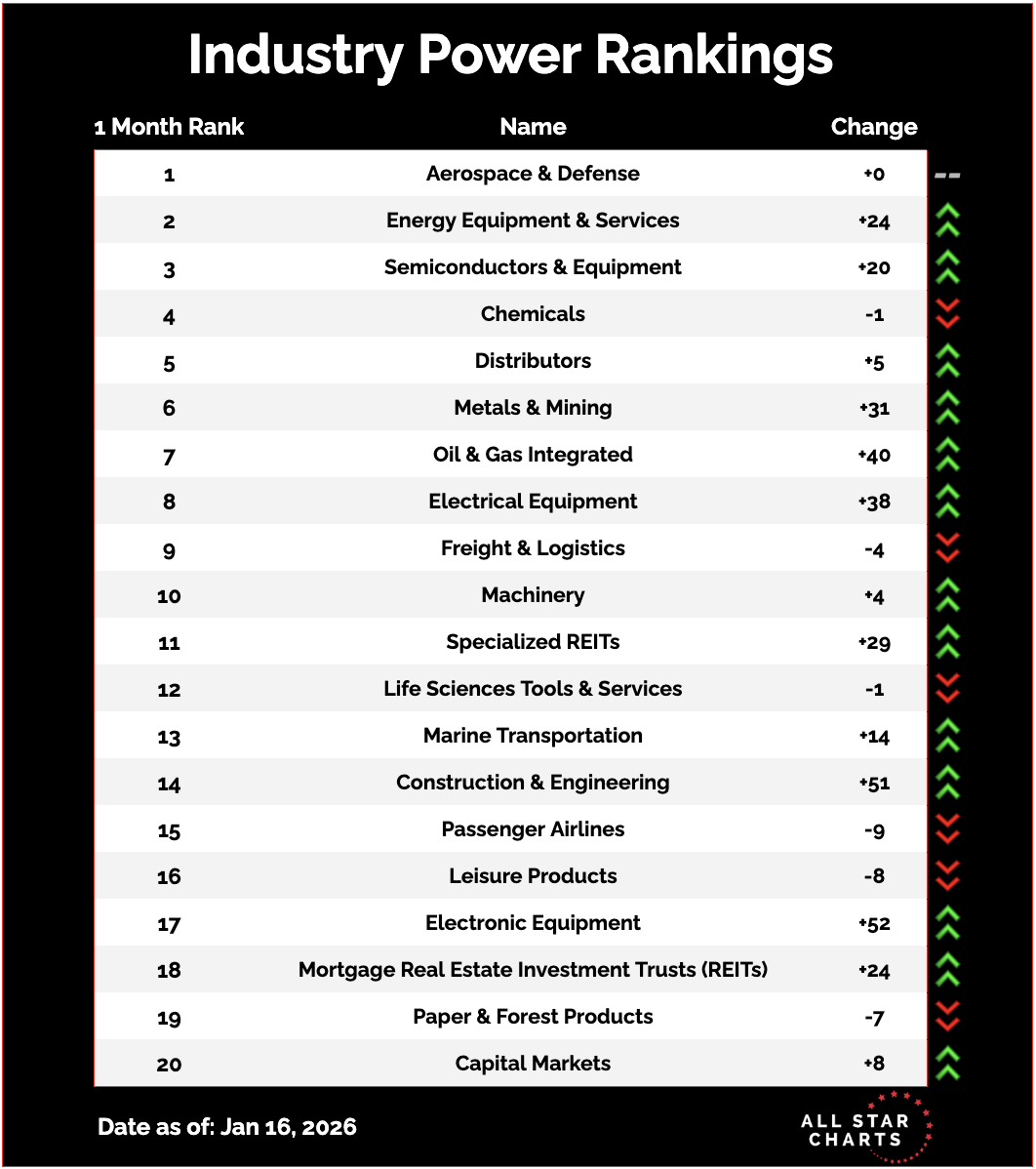 Members Only Top Down Trade of the Week (01/17/2026) Buying the reversal in a small-cap O&G leader By Steve Strazza January 17, 2026 Welcome back for another Top Down Trade of the Week.This is a classic leadership scan.We start with the best sectors, then drill into the subgroups. We pick one, and then take a look at the top stocks in it.Today’s standout is Energy, which jumped 6 spots straight to #1 this week. Here’s a look at our overall industry rankings, which show Energy Equipment & Services finding itself among the top 3. Energy stocks have started the year with bullish momentum and an overall broadening in participation at the sector-level. Here are the Top 10 names in the Energy Equipment & Services subsector, ranked by relative strength. Our team at ASC runs top-down scans daily, and with ASC Premium, you can access all our research and trade ideas risk-free. You need to have a subscription to access this content in full. Log in or subscribe today to unlock new features and receive Member Benefits. Log in or Subscribe The Strazza Letter Steve Strazza breaks down sector rotation and market leadership trends everyday. More from The Strazza Letter Steve Strazza Top Down Trade of the Week (01/10/2026) A chemical reaction January 10, 2026 Steve Strazza Top Down Trade of the Week (01/03/2026) A clean base breakout is setting up in chips January 3, 2026 Steve Strazza Top Down Trade of the Week (12/27/2025) Is it the base of the century? December 27, 2025 See Where Strength Is BuildingThe Strazza Letter dives into leadership, rotation, and momentum — revealing where market strength is building before it shows up on TV. You must have JavaScript enabled to use this form. Email Address More from All Star Charts Premium ASC Mastermind Join Today All Star Charts Gold Rush Join Today 2 to 100 Club Join Today