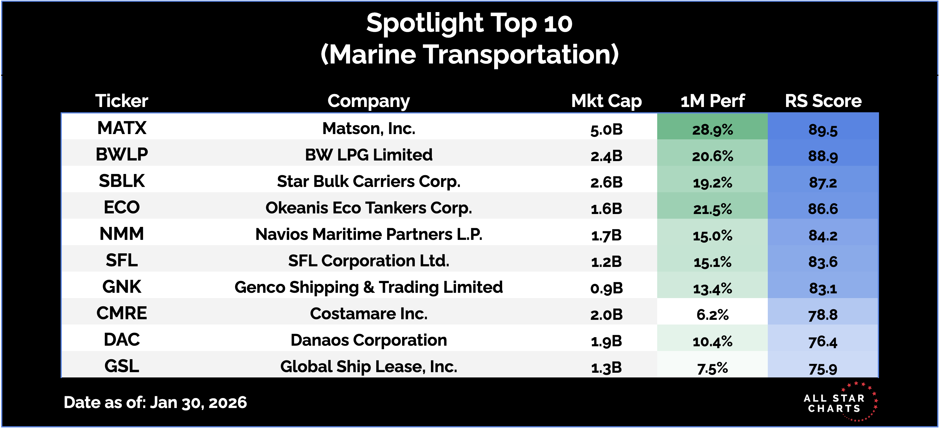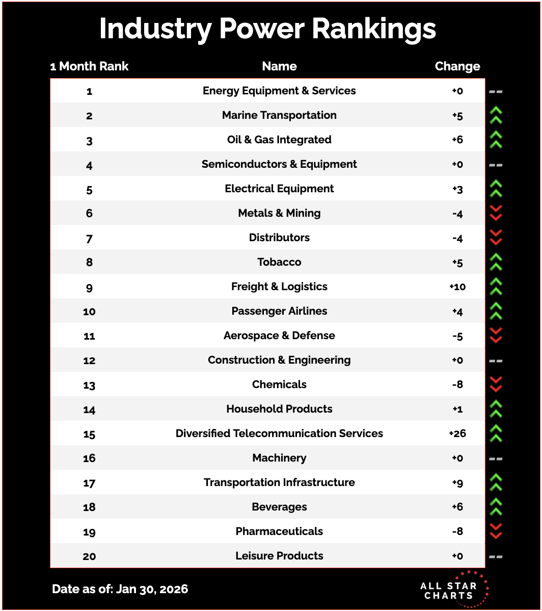 Members Only Top Down Trade of the Week (01/31/2026) Maritime stocks navigate a key reversal By Steve Strazza January 31, 2026 Welcome back for another Top Down Trade of the Week.This is a classic leadership scan.We start with the best sectors, then drill into the subgroups. We pick one, and then take a look at the top stocks in it.Today’s standout is Industrials, which continues to hold a top-three position in our sector rankings. The sector just registered fresh all-time monthly closing highs across large-, mid-, and small-cap indexes. Sector breadth is already strong and building, with a growing list of industry groups in steady uptrends.Here’s a look at our overall industry rankings, showing Marine Transportation in the second spot. Marine Transportation remains one of the most constructive groups within Industrials. Relative strength is firm, and several names are coiling at key levels, setting up for powerful upside resolutions in the future.Here are the Top 10 stocks in the Marine Transportation subsector, ranked by relative strength. Our team at ASC runs top-down scans daily, and with ASC Premium, you can access all our research and trade ideas risk-free. You need to have a subscription to access this content in full. Log in or subscribe today to unlock new features and receive Member Benefits. Log in or Subscribe The Strazza Letter Steve Strazza breaks down sector rotation and market leadership trends everyday. More from The Strazza Letter Steve Strazza Top Down Trade of the Week (01/24/2026) The industry group with the biggest reversal patterns January 24, 2026 Steve Strazza Top Down Trade of the Week (01/17/2026) Buying the reversal in a small-cap O&G leader January 17, 2026 Steve Strazza Top Down Trade of the Week (01/10/2026) A chemical reaction January 10, 2026 See Where Strength Is BuildingThe Strazza Letter dives into leadership, rotation, and momentum — revealing where market strength is building before it shows up on TV. You must have JavaScript enabled to use this form. Email Address More from All Star Charts Premium All Star Charts Premium Join Today 2 to 100 Club Join Today ASC Gold Rush Live Watch Now