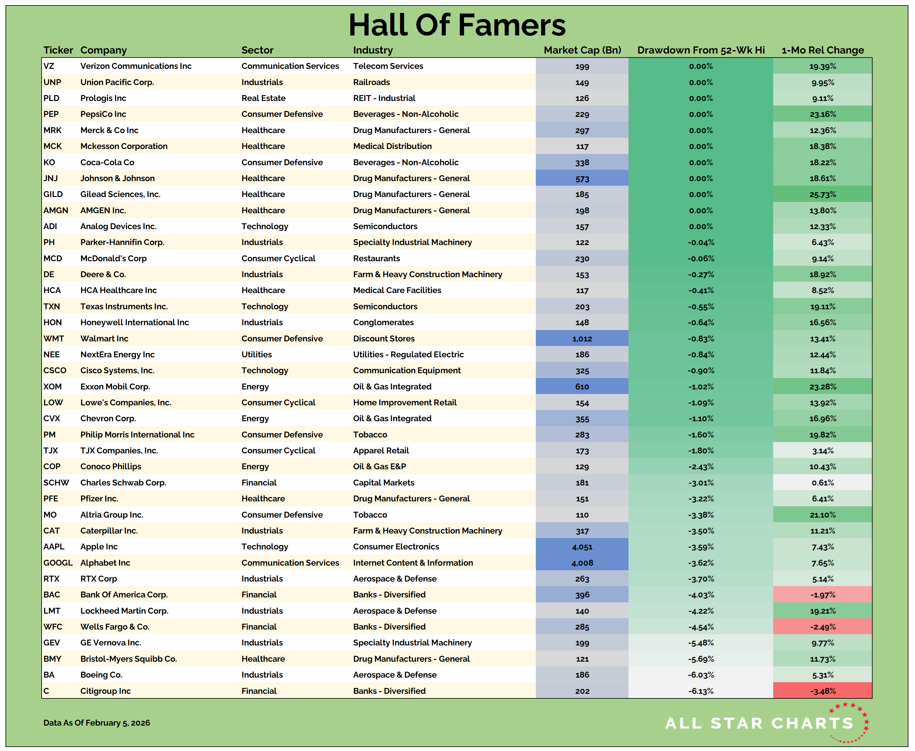 Our Hall of Famers list is composed of the 150 largest US-based stocks.