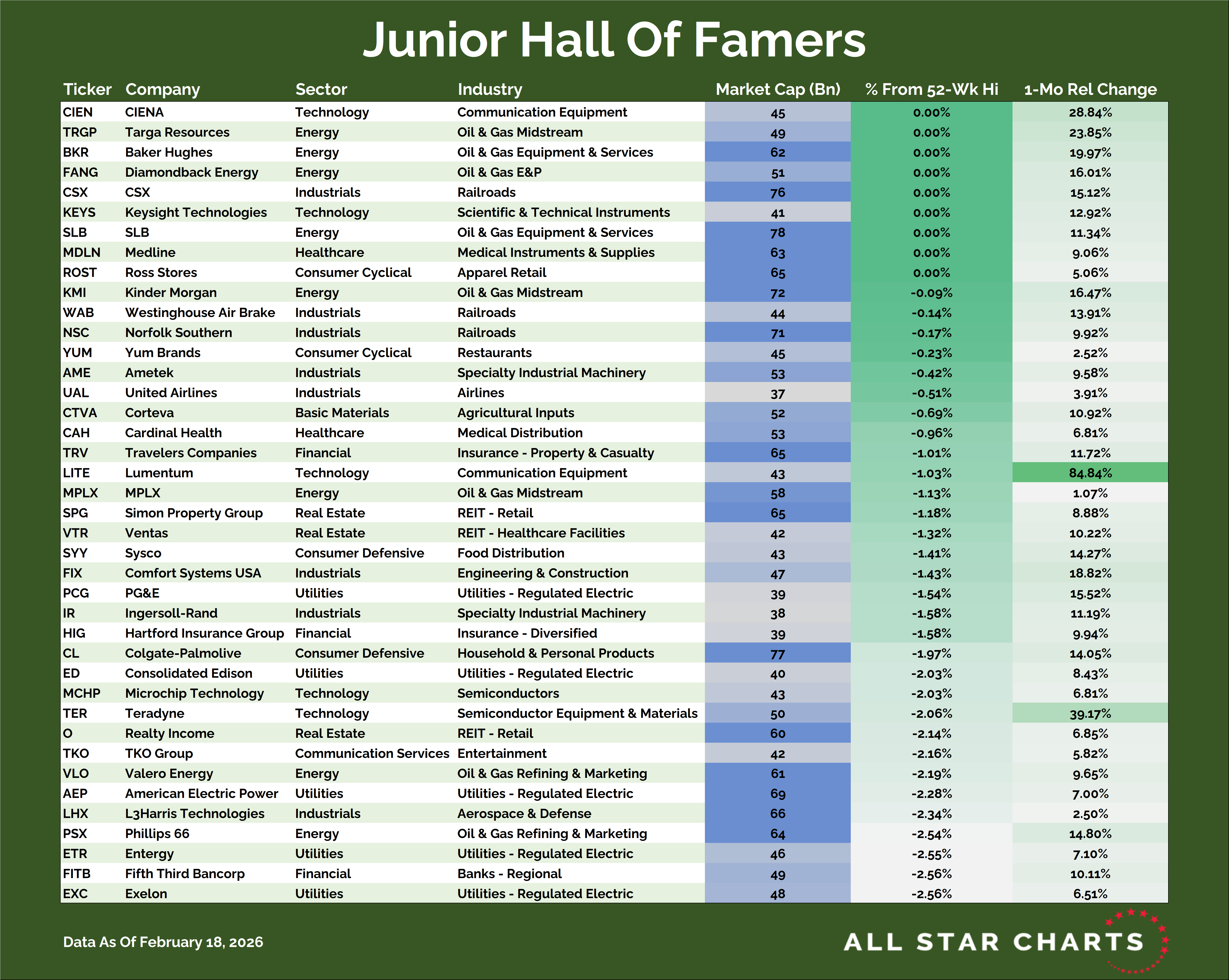 This scan is composed of the next 150 largest stocks by market cap, those that come after the top 150 and are thus covered by the Hall of Famers universe. Many of these names will someday graduate and join our original Hall Of Famers list. The idea here is to catch these big trends as early on as possible.