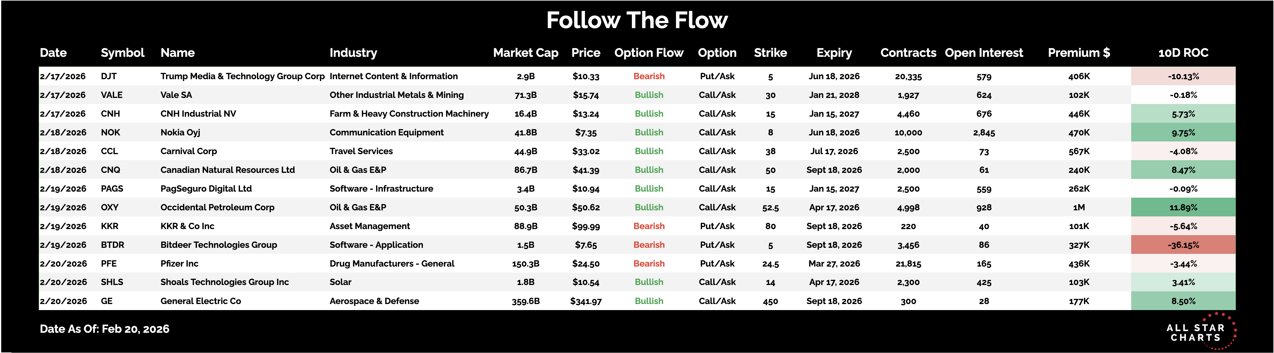 Members Only Follow the Flow Heavy Call Buying Signals Upside Conviction in Telecom Gear By Steve Strazza February 22, 2026 Every weekend I dig through the names that experienced the most interesting unusual options activity. We’re looking for trades that stood out, whether it was large in size or a very aggressive strike selection.This gives us a clean list to review and potentially add some names to our watchlists in preparation for the upcoming week.Here is the list of the most interesting Unusual Options activity from this past week: *Click to enlarge view You need to have a subscription to access this content in full. Log in or subscribe today to unlock new features and receive Member Benefits. Log in or Subscribe All Star Charts Premium Service Menu Service (ASC Premium) Trade Ideas Conference Calls Research Reports 2 to 100 Club Boomtown Commodities Weekly Currency Report Follow The Flow Freshly Squeezed Hall of Famers International Hall of Famers Junior Hall of Famers Junior International Hall of Famers Minor Leaguers The Gold Rush The Bond Report The Short Report Top Down Trade Of The Week Top Stocks Of The Month Under The Hood Young Aristocrats Saturday Morning Chartoons Contact More from All Star Charts Premium Steve Strazza Top Down Trade of the Week (02/21/2026) Buying new leadership in the sports apparel space February 21, 2026 Saturday Morning Chartoons: There's Strength Underneath the Surface February 21, 2026 Steve Strazza The Daily Flow Energy Transition & AI Hardware Rotation Fuel Bullish Conviction February 20, 2026 More from All Star Charts Premium The Strazza Letter Subscribe All Star Charts Gold Rush Join Today ASC Mastermind Join Today