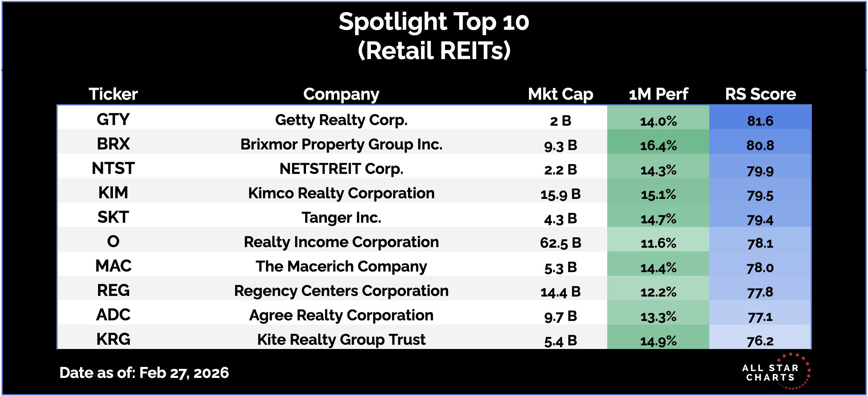 Here are the Top 10 names in the  Retail REITs subsector, ranked by relative strength.