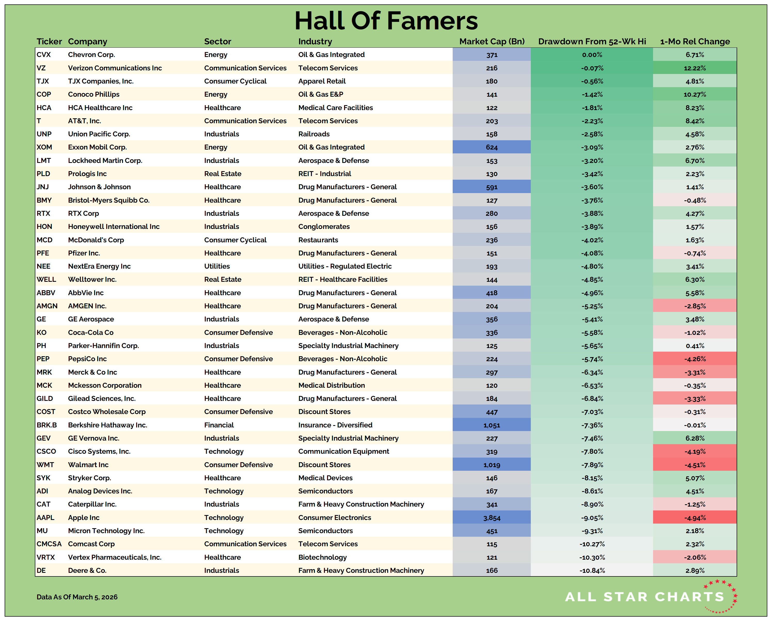 Our Hall of Famers list is composed of the 150 largest US-based stocks.