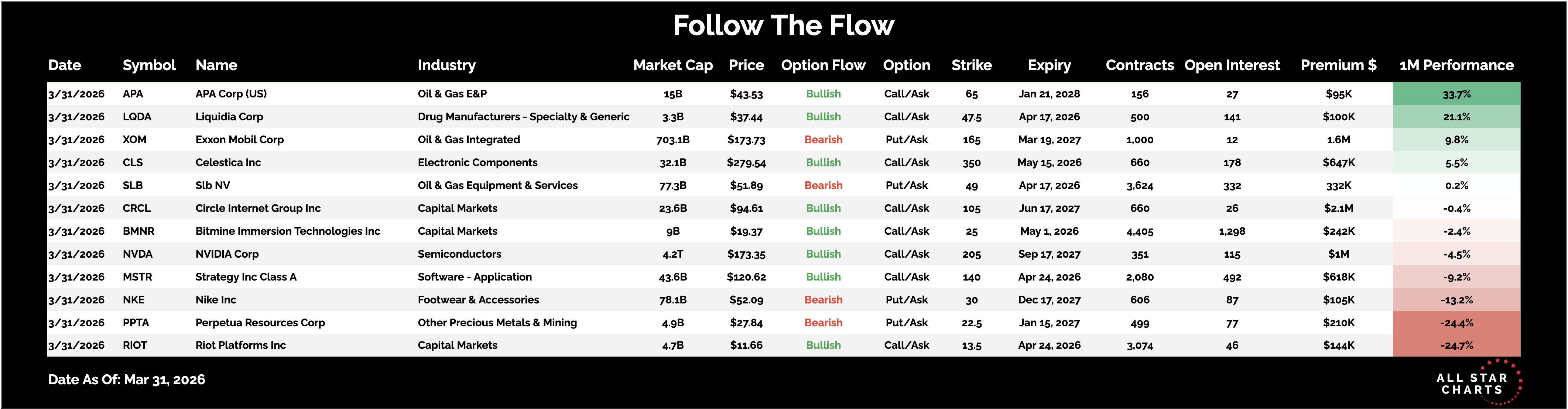 The Daily Flow Drilling, Building, and Healing By Steve Strazza March 31, 2026 This note highlights a select group of stocks showing the most unusual — and highly directional — options activity.The goal is simple: follow the big money and trade in the direction of the underlying trend.Here is the list of Unusual Options activity from March 31: *Click to enlarge viewLiquidia Corporation $LQDA — Momentum is building following the Yutrepia launch, and the market is starting to take notice.Traders stepped in with 500 contracts of the 4/17 $47.5 calls, a bullish bet right as price tests the post-IPO highs.Celestica Inc. $CLS — One of the cleaner AI infrastructure plays, with demand accelerating and a raised 2026 revenue target to $17B.A buyer came in with 350 contracts of the 5/15 $165 calls, a straightforward upside bet as the stock consolidates near highs.APA Corporation $APA — Permian-focused E&P that’s been on a tear, up over 30% in the past month with strong free cash flow.Longer-dated conviction showed up with 156 contracts of the 1/21/28 $95 calls, a patient bet allowing for consolidation before the next leg higher. All Star Charts Premium Service Menu Service (ASC Premium) Trade Ideas Conference Calls Research Reports 2 to 100 Club Boomtown Commodities Weekly Currency Report Follow The Flow Freshly Squeezed Hall of Famers International Hall of Famers Junior Hall of Famers Junior International Hall of Famers Minor Leaguers Supercycle Report The Bond Report The Short Report Top Down Trade Of The Week Top Stocks Of The Month Under The Hood Young Aristocrats Saturday Morning Chartoons Contact More from All Star Charts Premium Steve Strazza Ricardo Sarraf The Short Report March 31, 2026 Steve Strazza The Daily Flow Puts on fintech and banks, calls on EVs March 30, 2026 Steve Strazza Under The Hood March 30, 2026 More from All Star Charts Premium ASC Mastermind Join Today The Strazza Letter Subscribe 2 to 100 Club Join Today