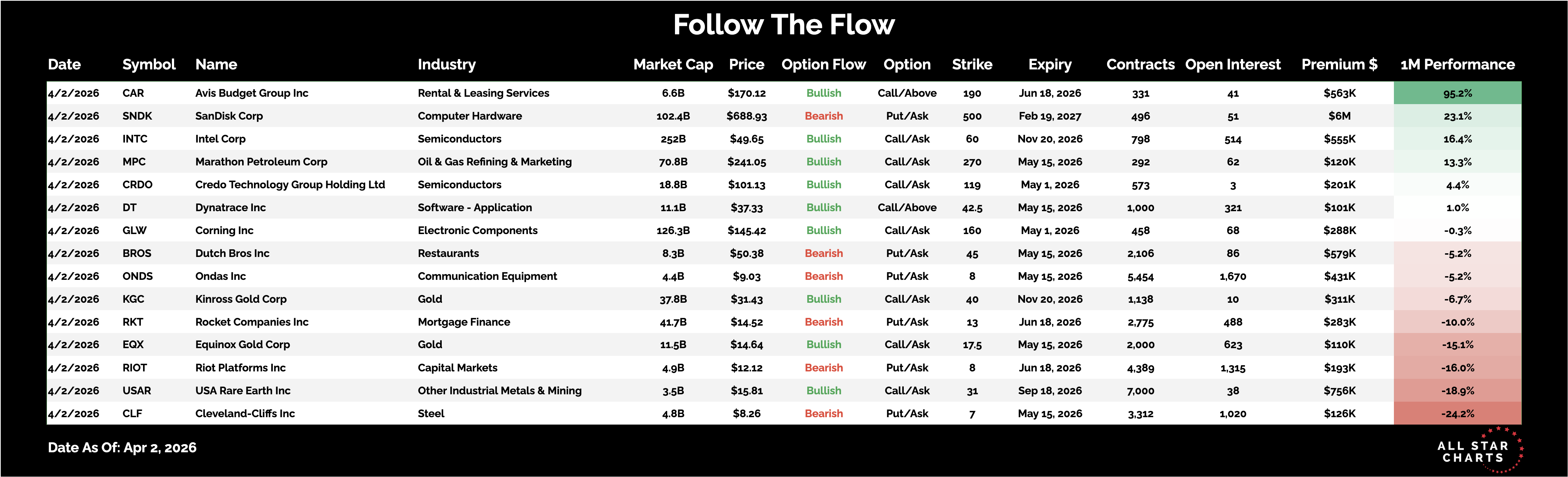 The Daily Flow Semis and Software Catch Bids while a Mortgage Name Feels the Heat By Steve Strazza April 2, 2026 This note highlights a select group of stocks showing the most unusual — and highly directional — options activity.The goal is simple: follow the big money and trade in the direction of the underlying trend.Here is the list of Unusual Options activity from April 2: *Click to enlarge viewIntel Corp $INTC — The semiconductor comeback story is gaining traction as Intel ramps its 18A process node and AI demand drives data center growth.Bullish flow showed up with 798 contracts of the 11/20 $60 calls, a longer-dated bet that the turnaround still has legs.Dynatrace Inc $DT — The stock has been grinding lower and is now trading down near a key level worth watching.One buyer jumped in with 1,000 contracts of the 5/15 $42.5 calls, positioning for a near-term bounce.Rocket Companies $RKT — The stock has been in a drawdown of roughly 40% to start the year, and one trader thinks there’s more to go. Bearish flow hit with 2,775 contracts of the 6/18 $13 puts, the largest bet of the day, signaling potential for further downside. All Star Charts Premium Service Menu Service (ASC Premium) Trade Ideas Conference Calls Research Reports 2 to 100 Club Boomtown Commodities Weekly Currency Report Follow The Flow Freshly Squeezed Hall of Famers International Hall of Famers Junior Hall of Famers Junior International Hall of Famers Minor Leaguers Supercycle Report The Bond Report The Short Report Top Down Trade Of The Week Top Stocks Of The Month Under The Hood Young Aristocrats Saturday Morning Chartoons Contact More from All Star Charts Premium Steve Strazza The Top Stocks of March April 2, 2026 Sam Gatlin Junior Hall of Famers April 2, 2026 Steve Strazza Monthly Strategy Session - April 2026 April 2, 2026 More from All Star Charts Premium 2 to 100 Club Join Today The Strazza Letter Subscribe ASC Mastermind Join Today