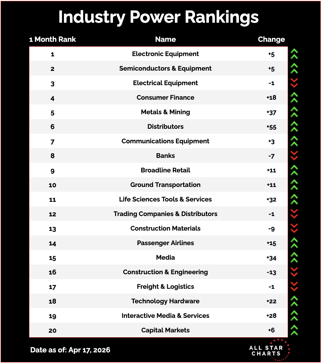 First, here’s our overall industry rankings, showing Semiconductors & Equipment up 5 spots to second place.