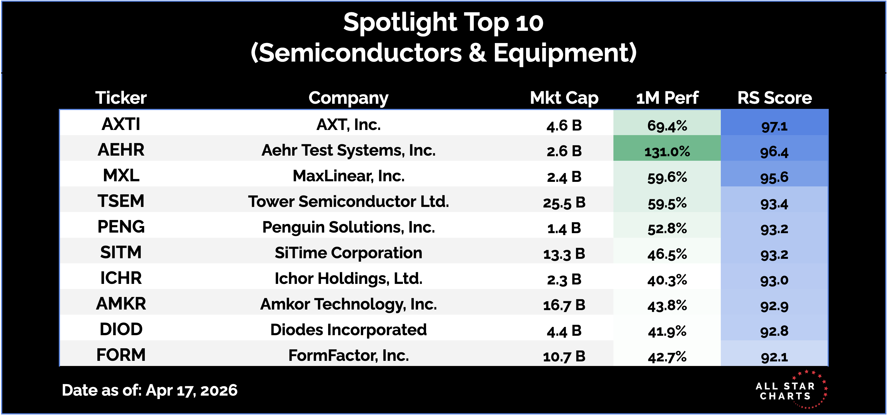 Here are the Top 10 names in the Semiconductors & Equipment subsector, ranked by relative strength.