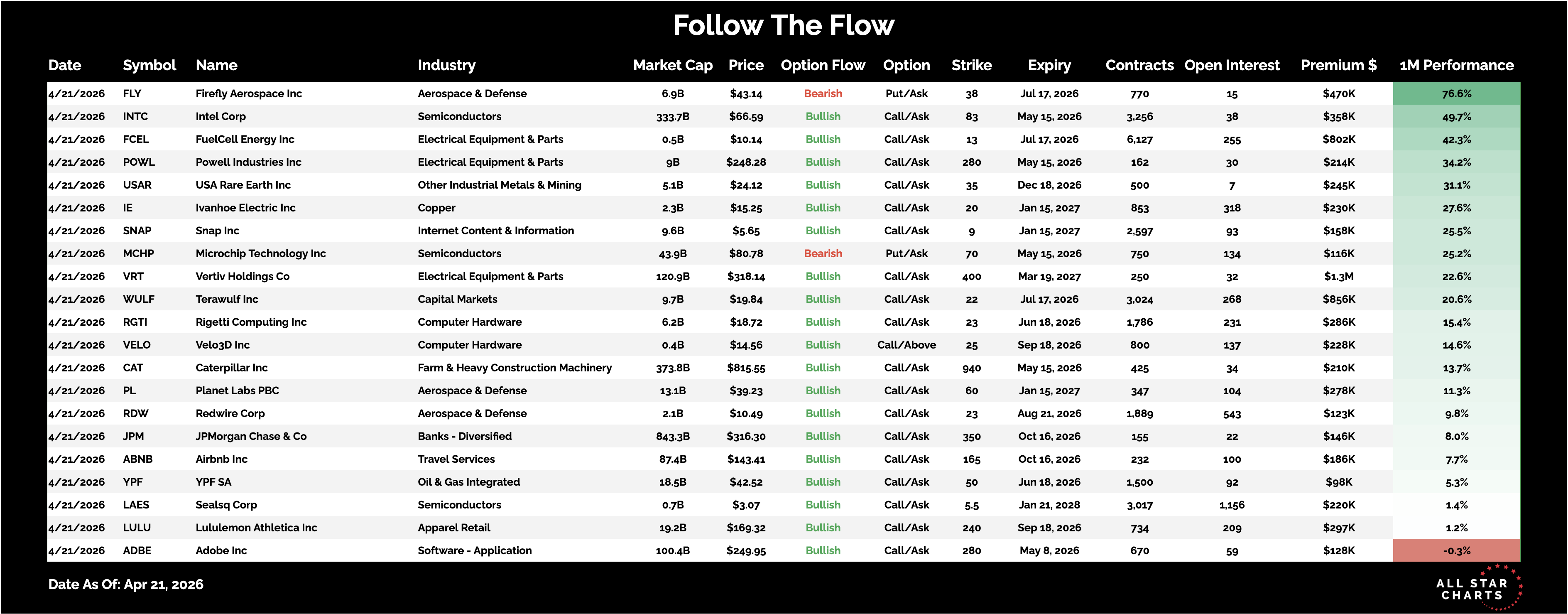 The Daily Flow Three Small Caps With Big Money Written All Over Them By Steve Strazza April 21, 2026 This note highlights a select group of stocks showing the most unusual — and highly directional — options activity.The goal is simple: follow the big money and trade in the direction of the underlying trend.Here is the list of Unusual Options activity from April 21: *Click to enlarge viewSealsq Corp $LAES — Semiconductor security is one of the most important corners of the market. Bullish flow showed up with 3,017 contracts of the 1/21/28 $5.50 calls, a long-term bet on meaningful upside.FuelCell Energy $FCEL — Clean energy names are finding their footing again, and FCEL is one of the more active ones in the flow. Traders stepped in with 6,127 contracts of the 7/17 $13 calls, a sizable directional bet on continued momentum.YPF SA $YPF — Argentina’s state oil giant is back in focus as Latin American energy gains traction.Bullish flow hit 1,500 contracts of the 6/18 $50 calls, positioning for a potential breakout as capital rotates back into the region. All Star Charts Premium Service Menu Service (ASC Premium) Trade Ideas Conference Calls Research Reports 2 to 100 Club Boomtown Commodities Weekly Currency Report Follow The Flow Freshly Squeezed Hall of Famers International Hall of Famers Junior Hall of Famers Junior International Hall of Famers Minor Leaguers Supercycle Report The Bond Report The Short Report Top Down Trade Of The Week Top Stocks Of The Month Under The Hood Young Aristocrats Saturday Morning Chartoons Contact More from All Star Charts Premium Ricardo Sarraf 2 to 100 Club April 22, 2026 Steve Strazza The Daily Flow Three names, one theme: the infrastructure behind the next leg of power demand April 22, 2026 Steve Strazza The Daily Flow AI Connectivity, Oncology Catalysts, and Next-Gen Batteries Are Lighting Up the Flow April 20, 2026 More from All Star Charts Premium 2 to 100 Club Join Today ASC Mastermind Join Today The Strazza Letter Subscribe