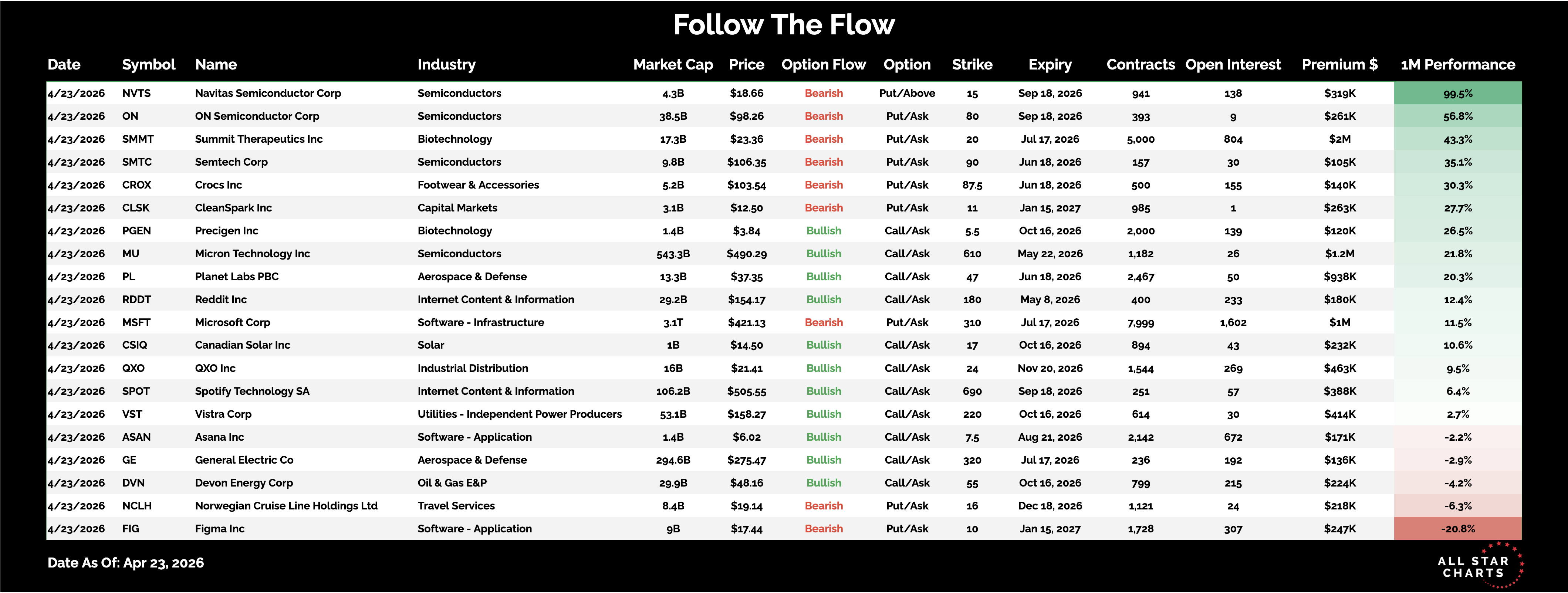 The Daily Flow Bulls and bears are both showing up with conviction today By Steve Strazza April 23, 2026 This note highlights a select group of stocks showing the most unusual — and highly directional — options activity.The goal is simple: follow the big money and trade in the direction of the underlying trend.Here is the list of Unusual Options activity from April 23: *Click to enlarge viewSummit Therapeutics Inc $SMMT — Up over 40% in the past month, but the options market is pushing back.5,000 contracts of the 6/18 $20 puts traded for $2M in premium, suggesting the move may be stretched.Planet Labs PBC $PL — Momentum remains strong in this space-based intelligence name.2,467 contracts of the 6/18 $47 calls (~$938K premium) signal expectations for further upside.Crocs Inc $CROX — After a 30% run, traders are betting the rally may fade.500 contracts of the 6/18 $87.50 puts point to potential downside. All Star Charts Premium Service Menu Service (ASC Premium) Trade Ideas Conference Calls Research Reports 2 to 100 Club Boomtown Commodities Weekly Currency Report Follow The Flow Freshly Squeezed Hall of Famers International Hall of Famers Junior Hall of Famers Junior International Hall of Famers Minor Leaguers Supercycle Report The Bond Report The Short Report Top Down Trade Of The Week Top Stocks Of The Month Under The Hood Young Aristocrats Saturday Morning Chartoons Contact More from All Star Charts Premium Steve Strazza Young Aristocrats (April 2026) April 28, 2026 Steve Strazza The Daily Flow The big money doesn't ask for permission. It just moves. April 27, 2026 Steve Strazza Under The Hood April 27, 2026 More from All Star Charts Premium The Strazza Letter Subscribe 2 to 100 Club Join Today ASC Mastermind Join Today