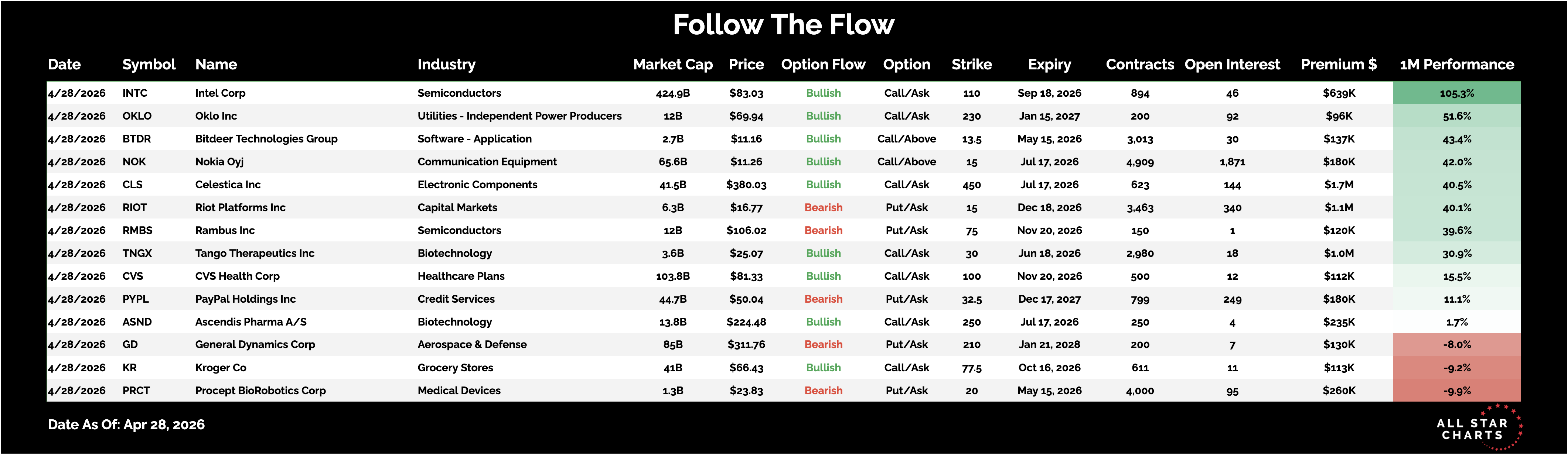 The Daily Flow A $1.7M bet, a million-dollar conviction, and 4,000 contracts of doubt By Steve Strazza April 28, 2026 This note highlights a select group of stocks showing the most unusual — and highly directional — options activity.The goal is simple: follow the big money and trade in the direction of the underlying trend.Here is the list of Unusual Options activity from April 28: *Click to enlarge viewCelestica Inc $CLS — Electronic components remain one of the strongest pockets in the market.Traders stepped in with 623 contracts of the 7/17 $450 calls, putting $1.7M in premium to work.Tango Therapeutics $TNGX — Biotech flow continues to build as momentum starts to re-emerge.Bullish activity hit 2,980 contracts of the 6/18 $30 calls, roughly $1M in premium.Procept BioRobotics $PRCT — Medical devices are under pressure, and this one is starting to crack.Bearish flow showed up with 4,000 contracts of the 5/15 $20 puts, a notable downside print. All Star Charts Premium Service Menu Service (ASC Premium) Trade Ideas Conference Calls Research Reports 2 to 100 Club Boomtown Commodities Weekly Currency Report Follow The Flow Freshly Squeezed Hall of Famers International Hall of Famers Junior Hall of Famers Junior International Hall of Famers Minor Leaguers Supercycle Report The Bond Report The Short Report Top Down Trade Of The Week Top Stocks Of The Month Under The Hood Young Aristocrats Saturday Morning Chartoons Contact More from All Star Charts Premium Sam Gatlin Junior International Hall of Famers April 30, 2026 Steve Strazza The Daily Flow Bears in the Retail Aisle, Bulls at the Terminal April 29, 2026 Ricardo Sarraf 2 to 100 Club April 29, 2026 More from All Star Charts Premium The Strazza Letter Subscribe ASC Mastermind Join Today 2 to 100 Club Join Today