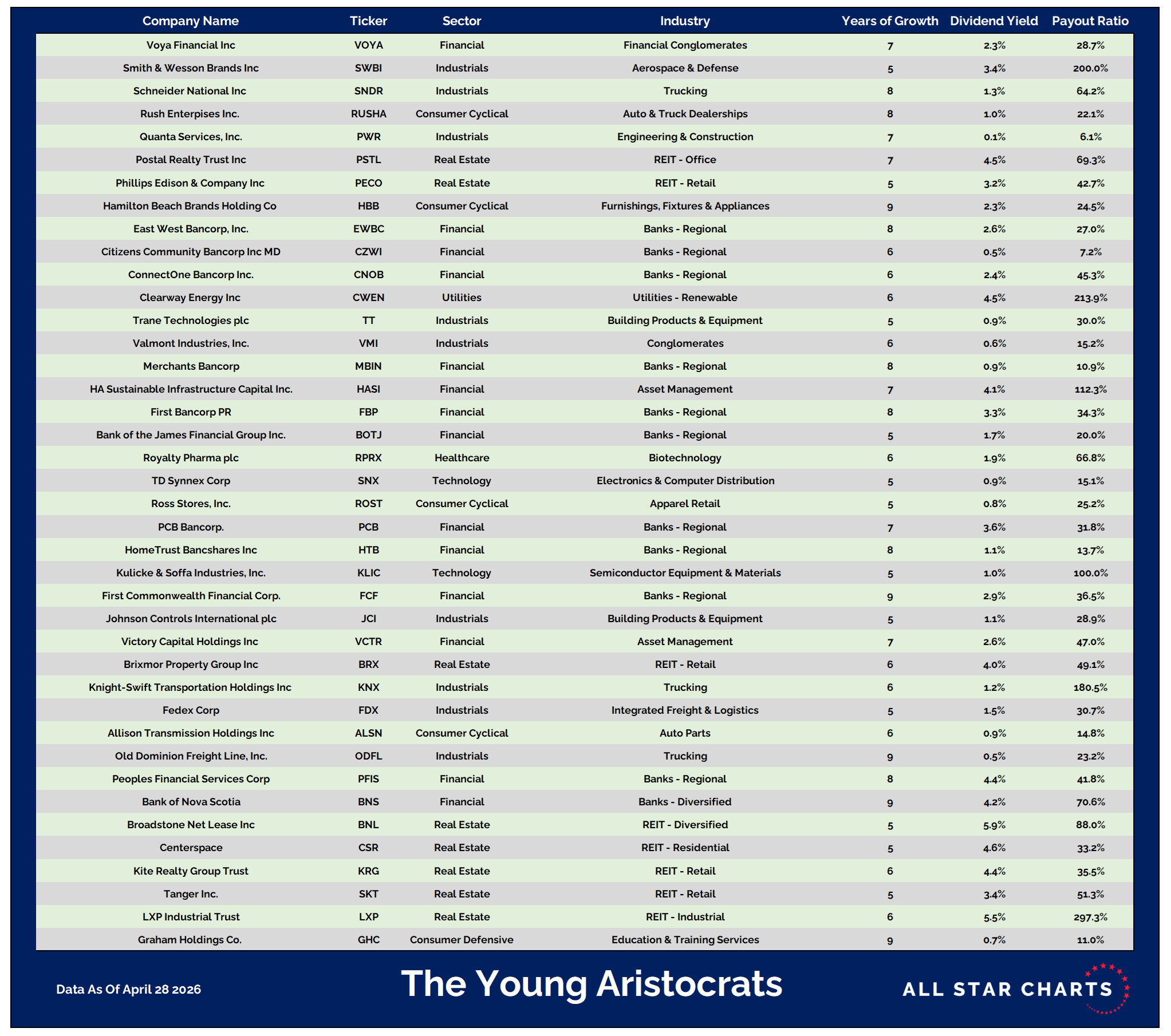 We call them the Young Aristocrats, and the idea is that these are "stocks that pay you to make money." Imagine if years of consistent dividend growth and high momentum and relative strength had a baby, leaving you with the best of the emerging dividend giants that are outperforming the averages.