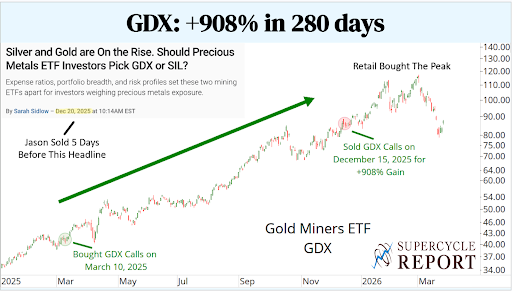 Options Trades: For subscribers who want to amplify their returns, Jason overlays options trades on large, liquid ETFs – like GDX, GLD, SLV, and USO – and stocks with liquid options chains. These are medium to long-term positions designed to capture the fat part of each sector's move. You’ll get 1-2 options trades per month.