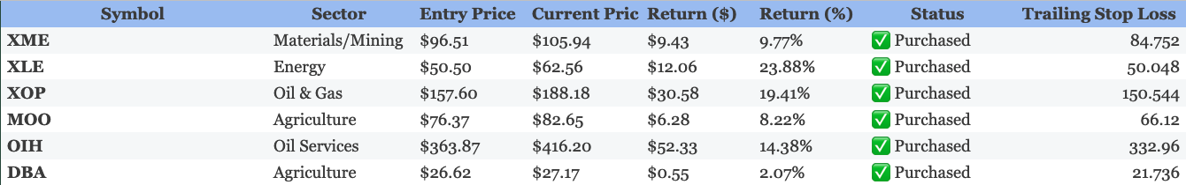 Our current holdings include exposure to Materials/Mining (XME), Energy (XLE), Oil & Gas (XOP), Oil Services (OIH), and Agriculture (MOO, DBA) — a strategic mix designed to capture strength across commodities, production, and global demand trends.