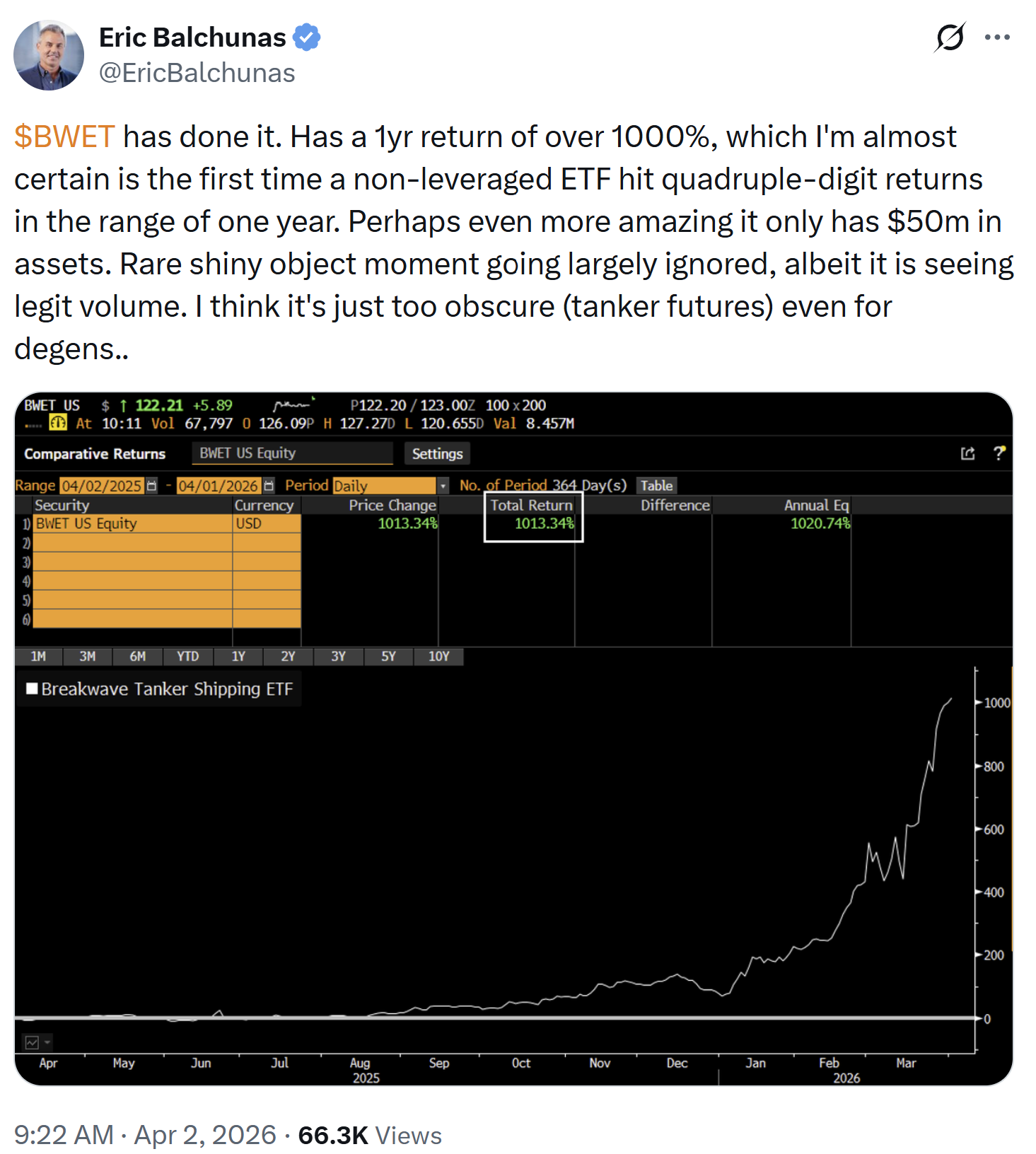 Earlier this week, Bloomberg ETF analyst Eric Balchunas pointed out something remarkable. A niche tanker ETF just printed a 1,000% return in a single year.