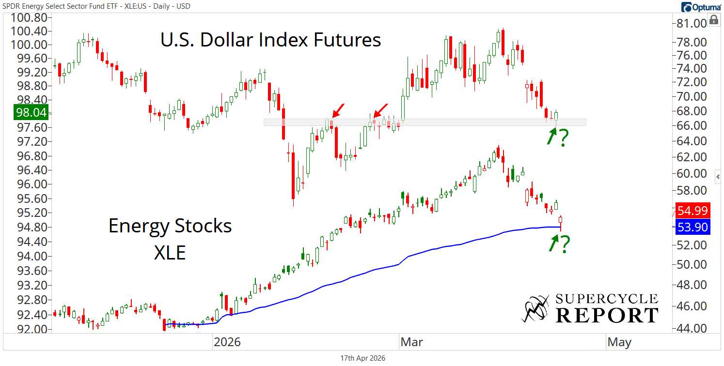 If XLE is going to catch a bid here, we expect the dollar to do the same. These two have been moving together, and the odds favor the positive correlation remaining in place.