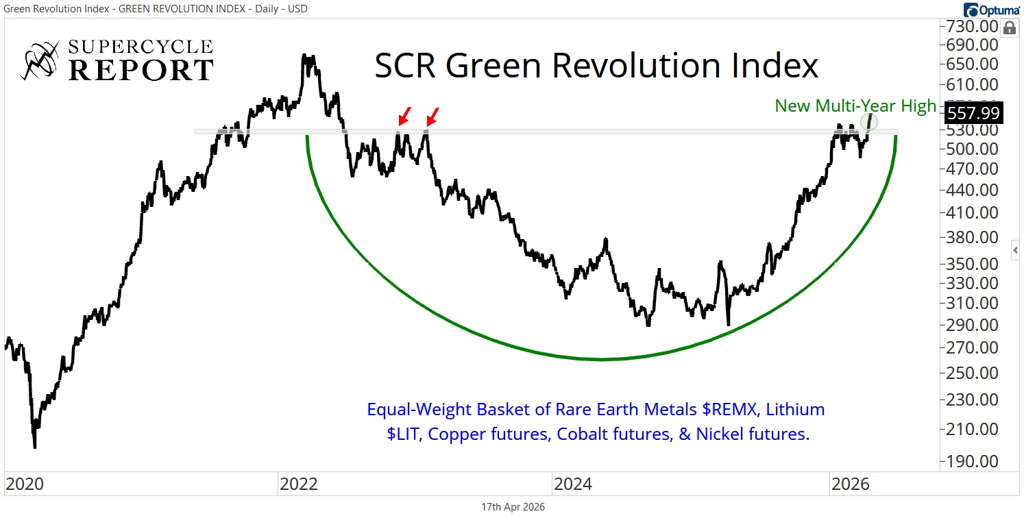 Our Green Revolution Index, an equal-weight basket of rare earths, Lithium, Copper, Cobalt, and Nickel, just broke out to new multi-year highs.